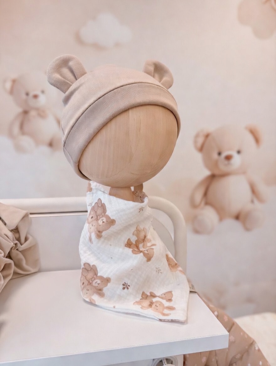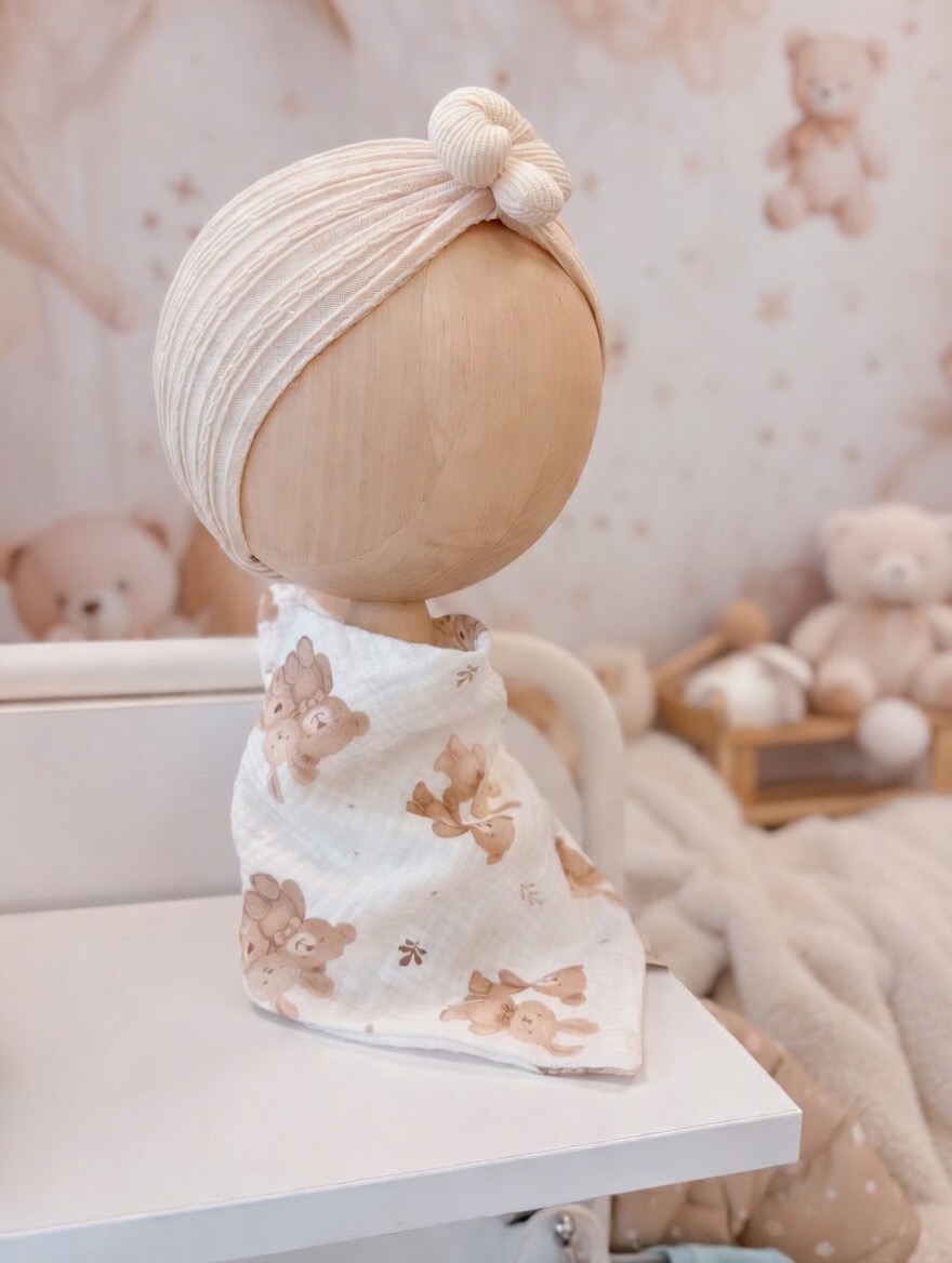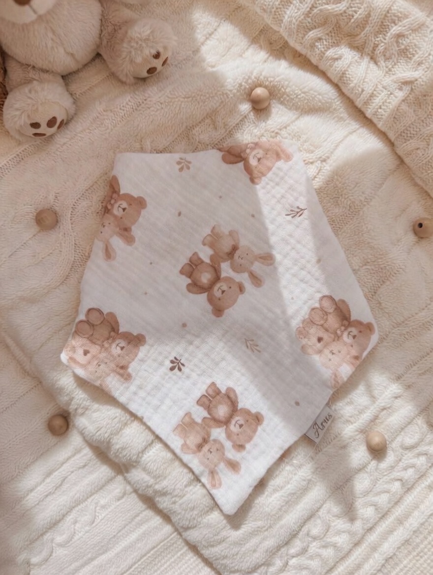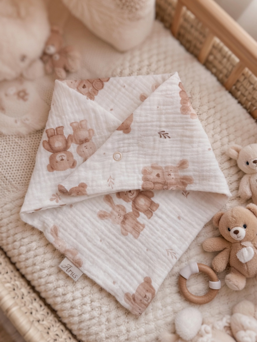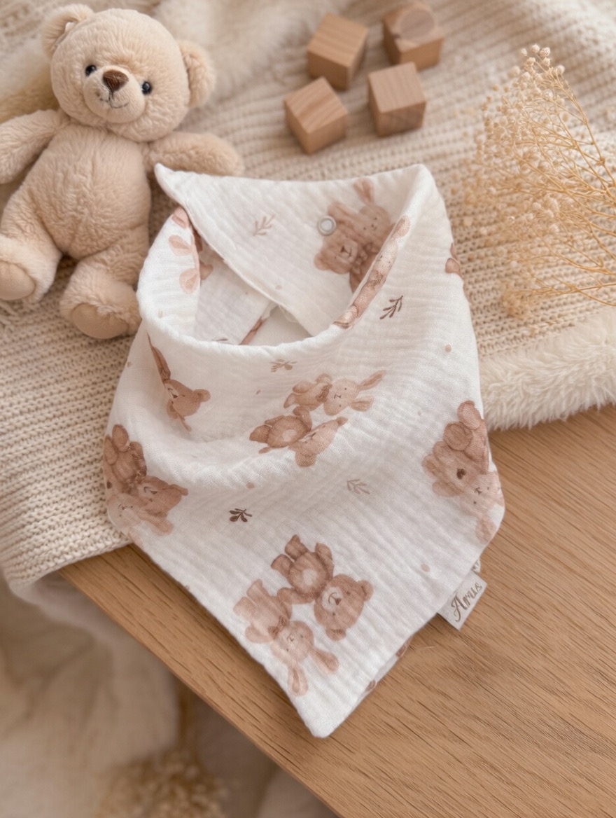 Ręcznie szyta chustka z 100% muślinu bawełnianego premium. Delikatna, lekka i oddychająca – stworzona specjalnie dla wrażliwej skóry niemowląt.