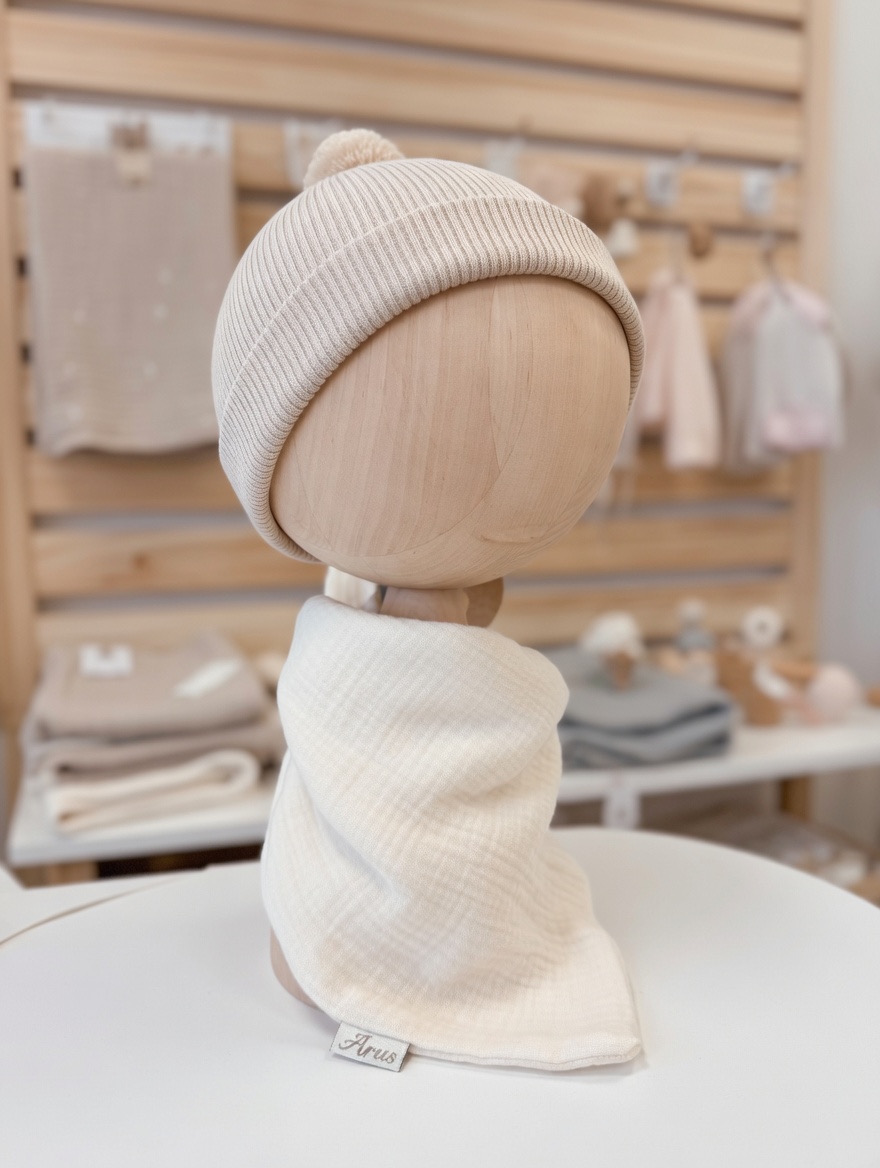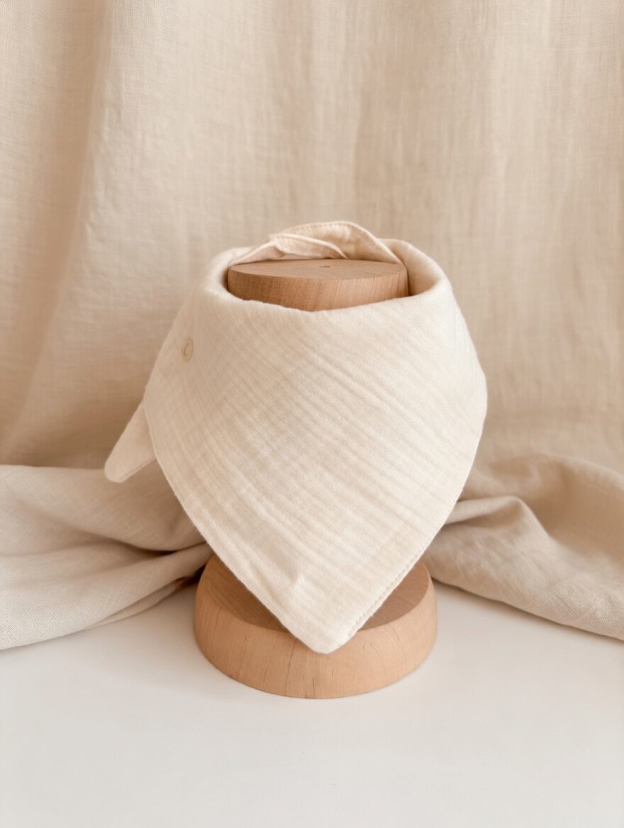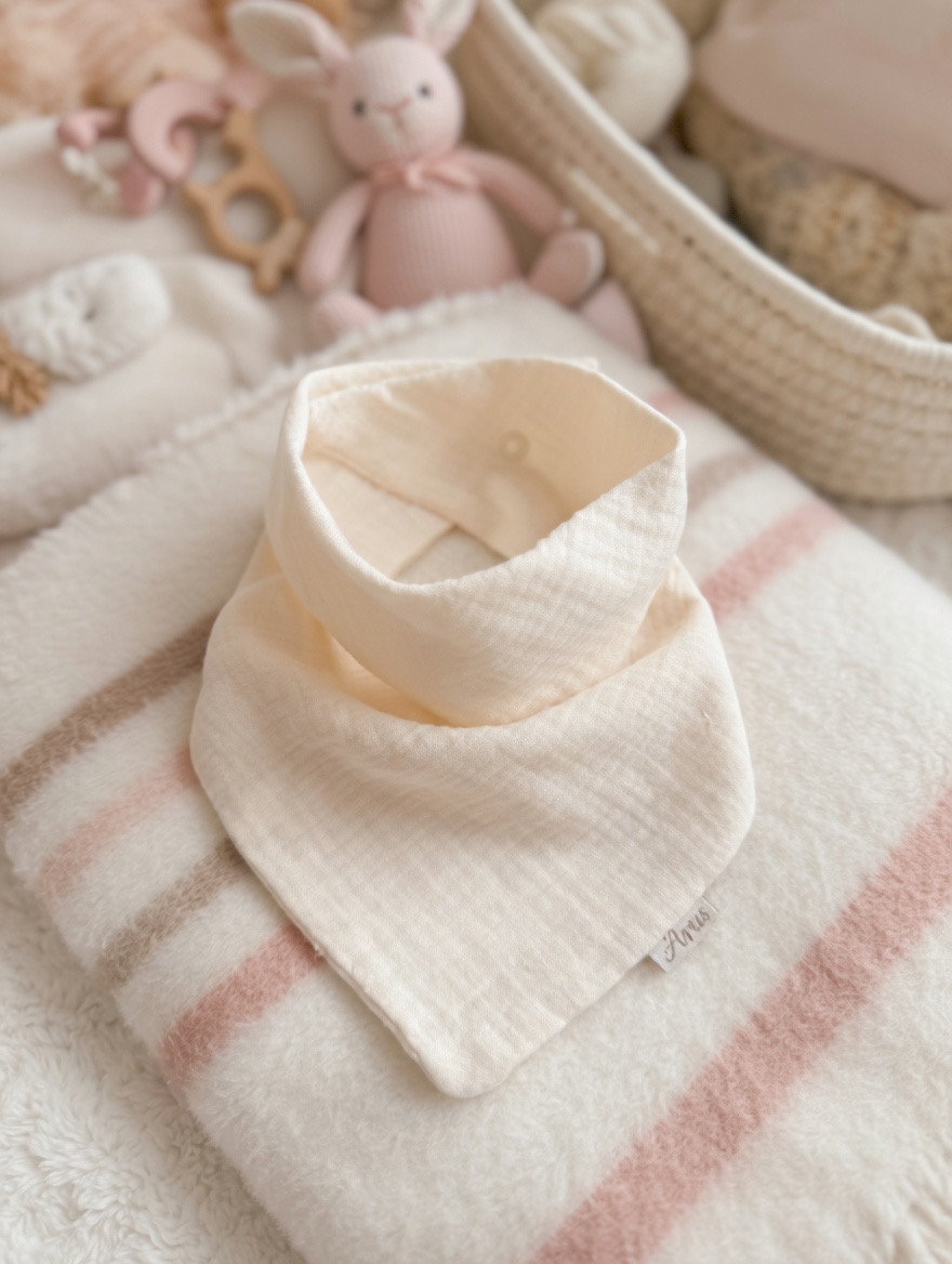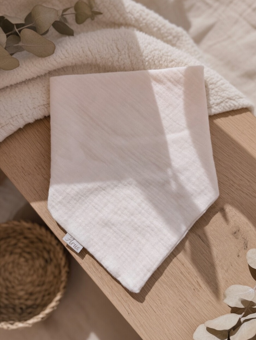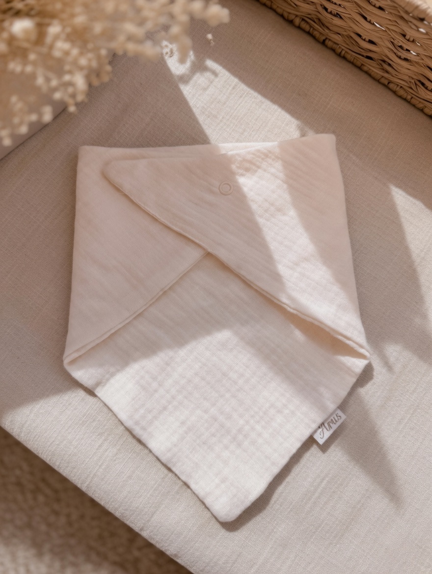 Ręcznie szyta chustka z 100% muślinu bawełnianego premium. Delikatna, lekka i oddychająca – stworzona specjalnie dla wrażliwej skóry niemowląt.