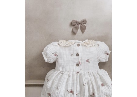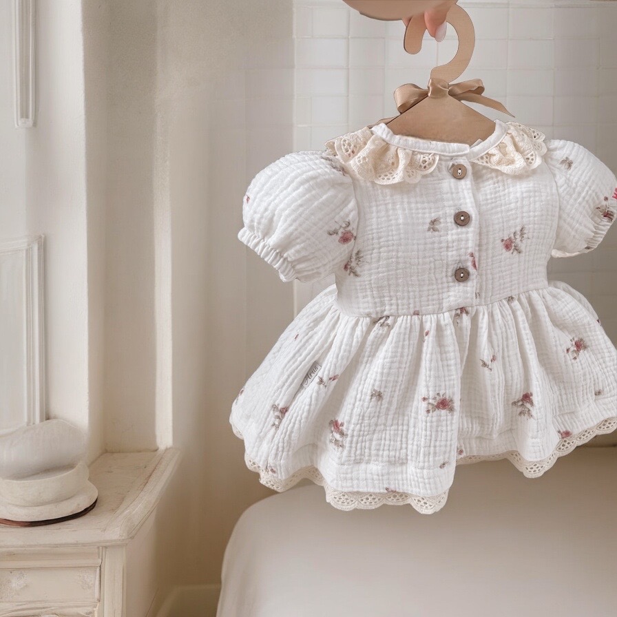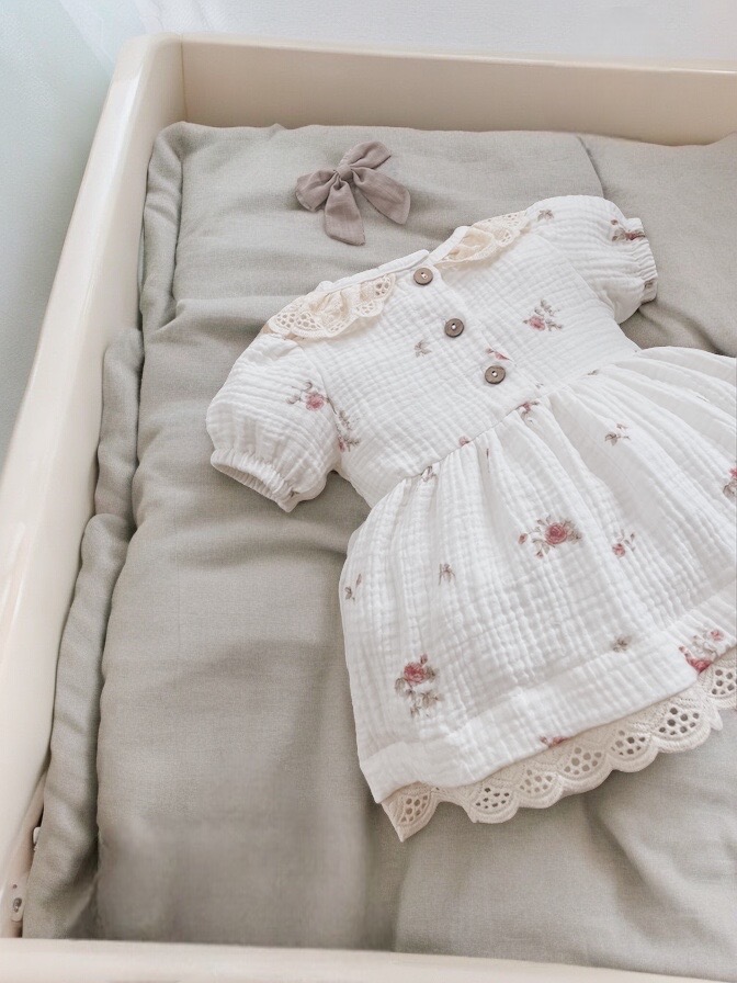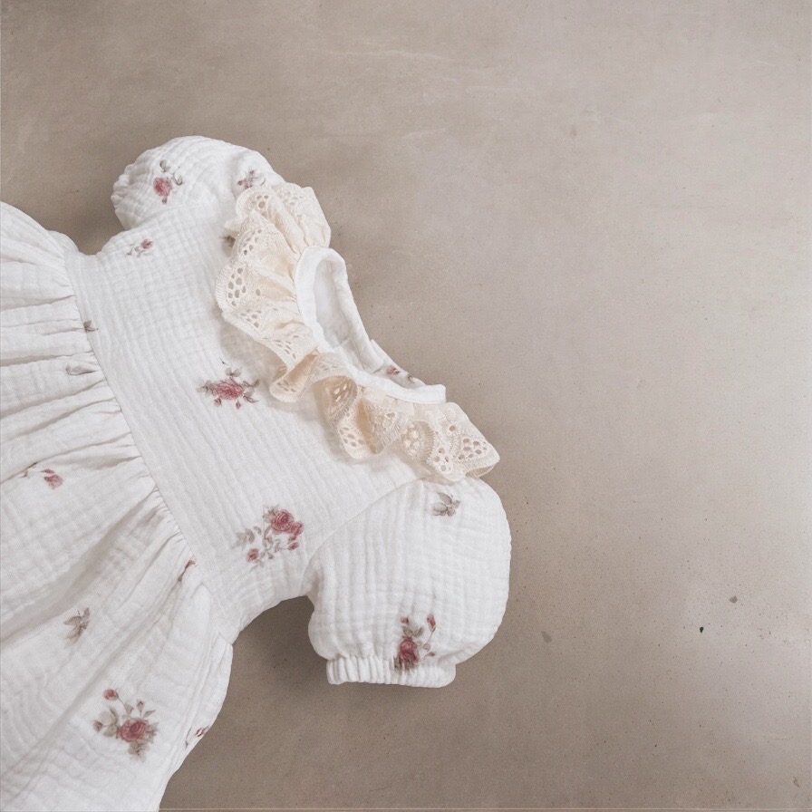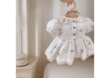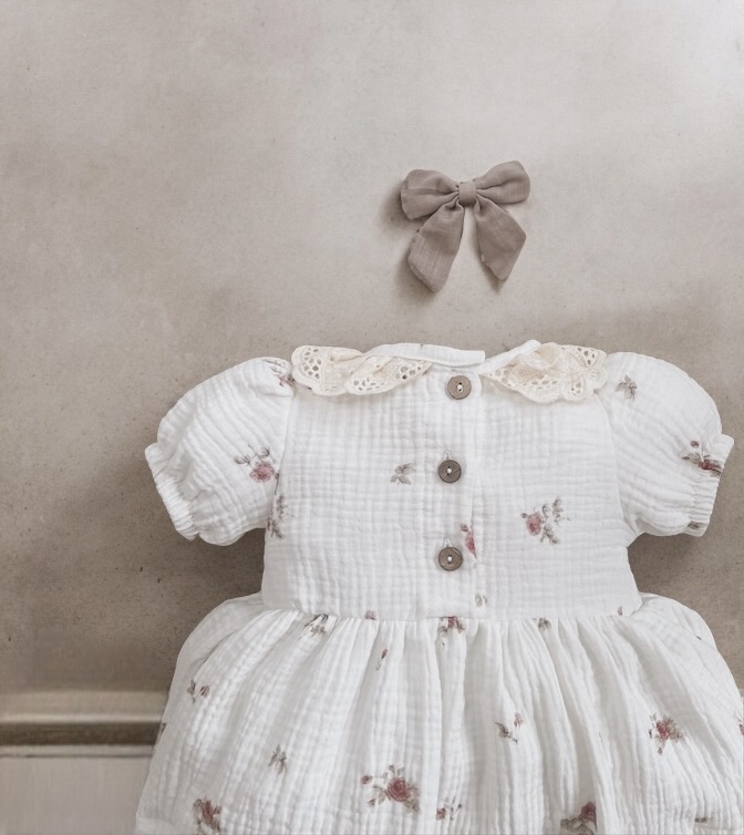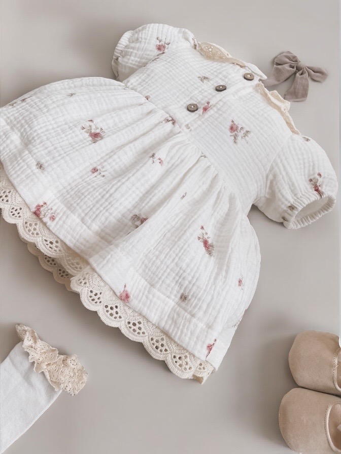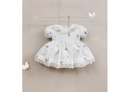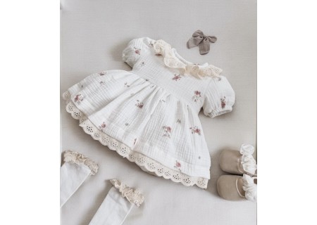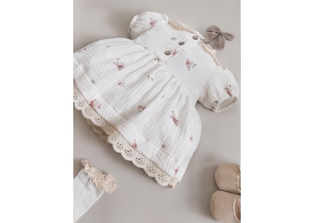 Produkt wykonany z bawełny ekologicznej - muślinu typu double gaze. Rozkoszna, lekka i zwiewna sukienka z bufkami na ramionach, i guzikami z tyłu na plecach.