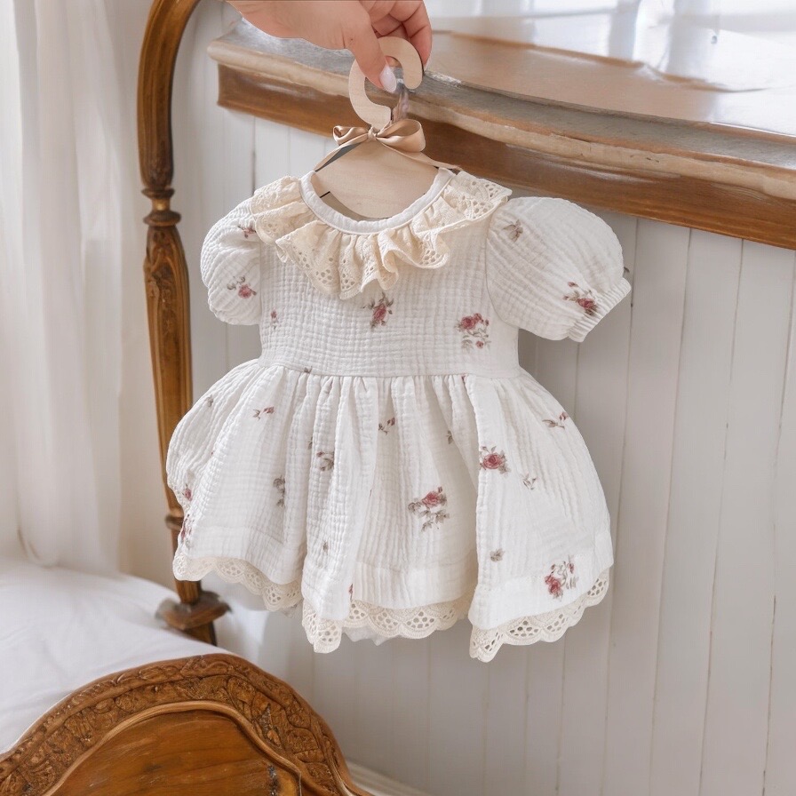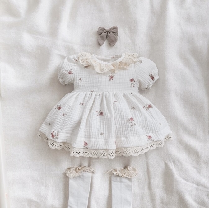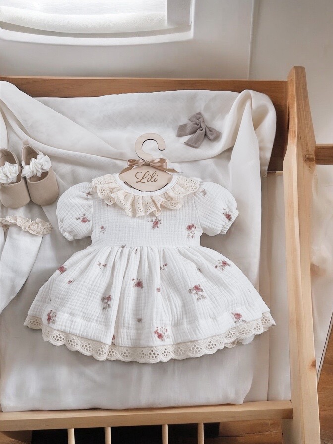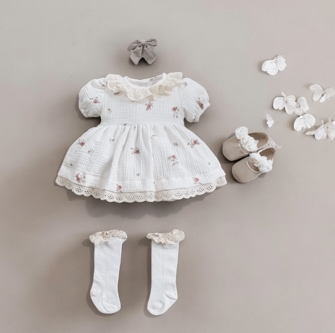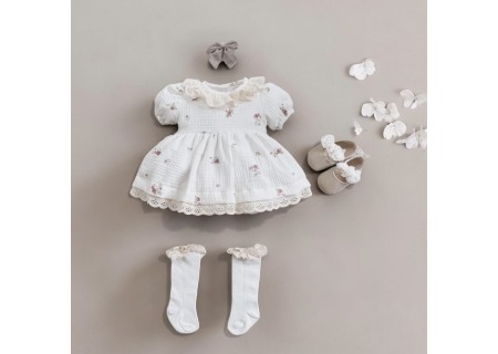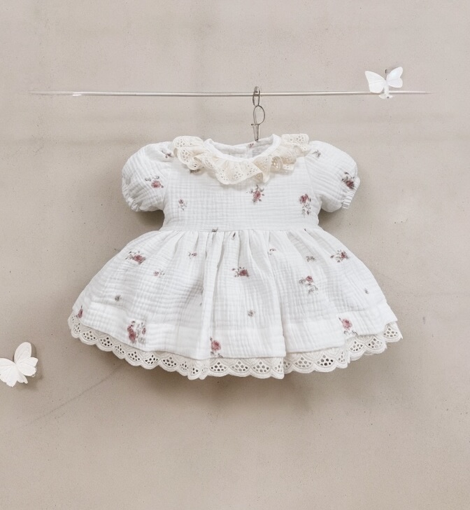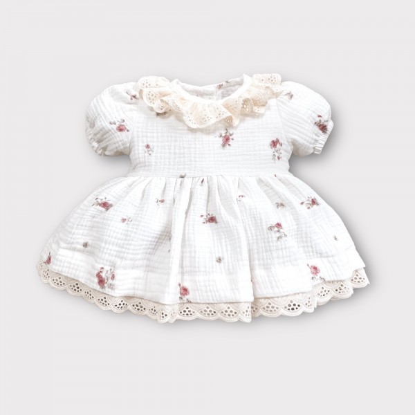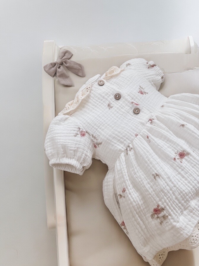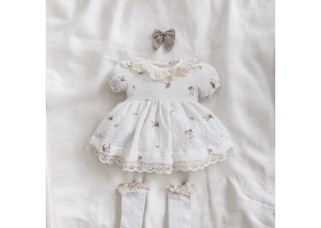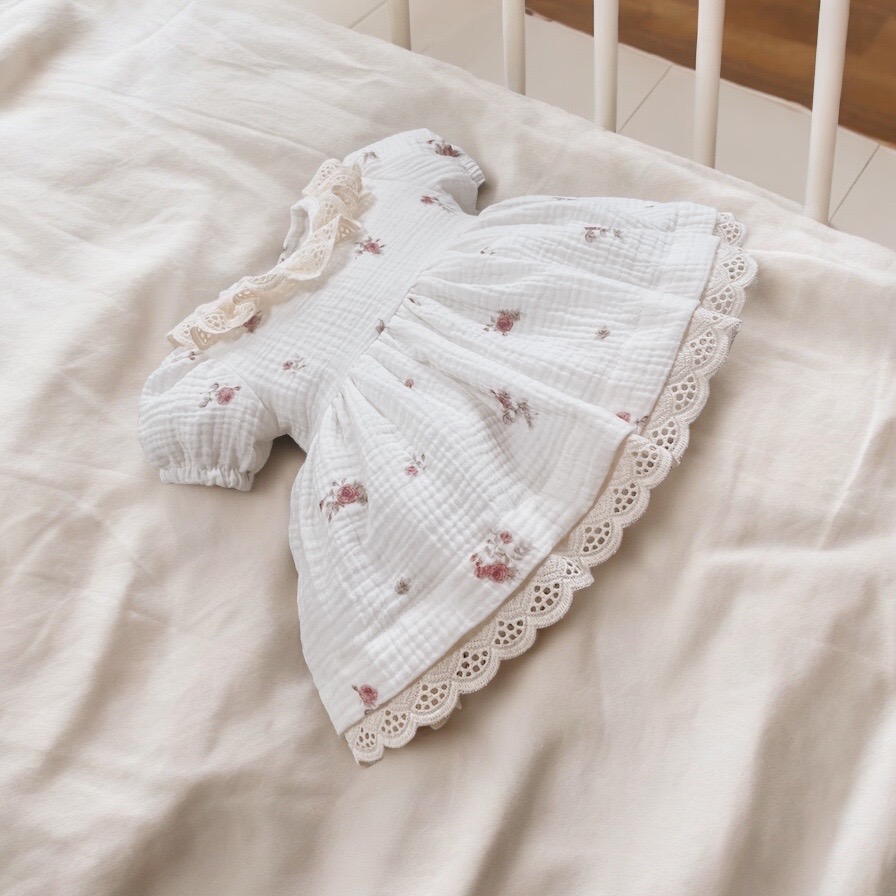 Produkt wykonany z bawełny ekologicznej - muślinu typu double gaze. Rozkoszna, lekka i zwiewna sukienka z bufkami na ramionach, i guzikami z tyłu na plecach.