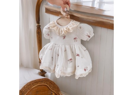 Sukienka letnia z bufkami i haftowanym kołnierzykiem z delikatnym motywem kwiatów.