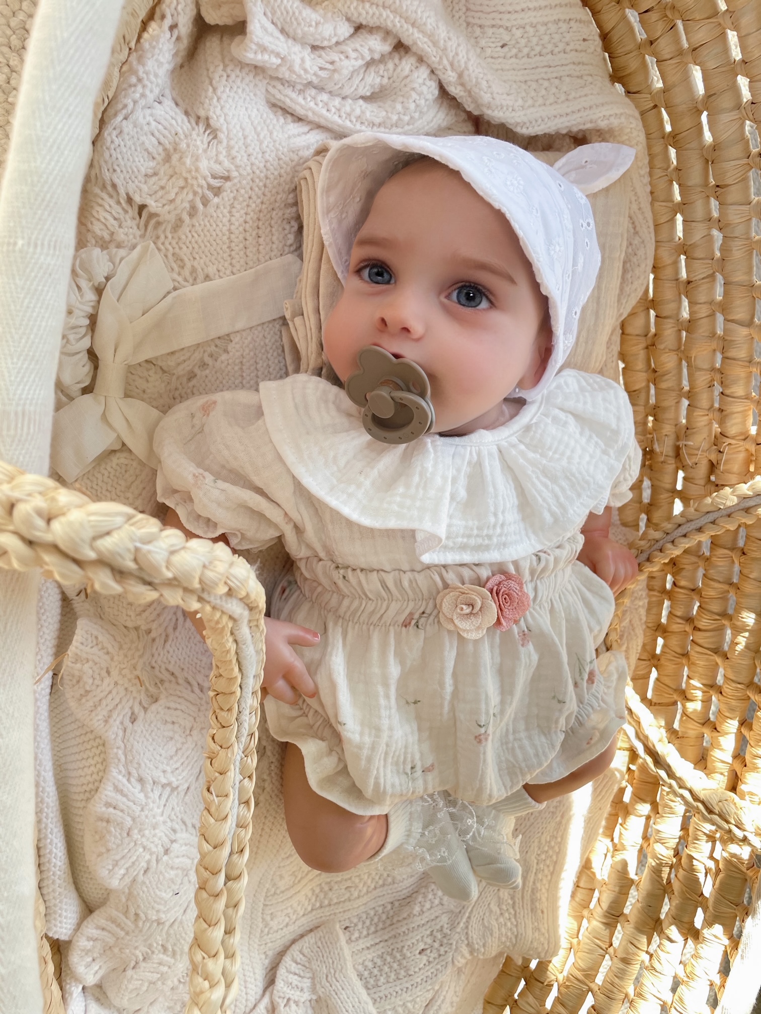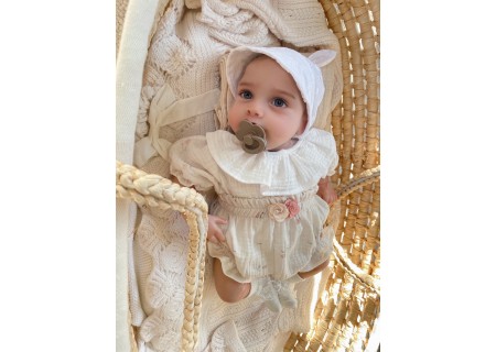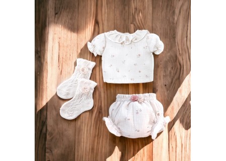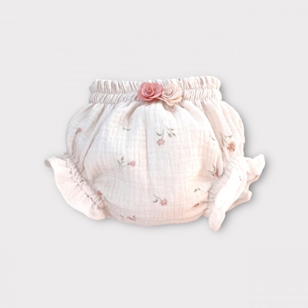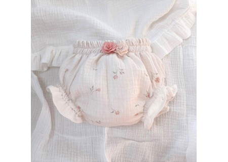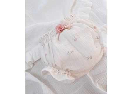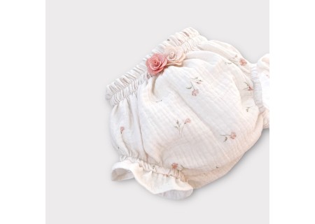 Muślinowe bloomersy z falbankami i aplikacją w formie kwiatów.
