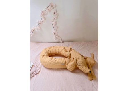 Ochraniacz jamnik ma długość ok 180 cm i uszyty jest z tkaniny bawełnianej o wafelkowym splocie posiadającej certyfikat Oeko-Tex Standard 100 oraz wypełniony jest antyalergicznym puchem silikonowym.