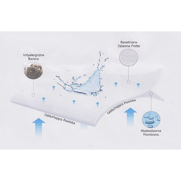 Wykonany z wysokiej jakości dzianiny frotte z membraną PU -nieprzemakalna i przepuszczająca powietrze ( oddychająca ) dzięki zastosowaniu elastycznej membrany poliuretanowej PU .