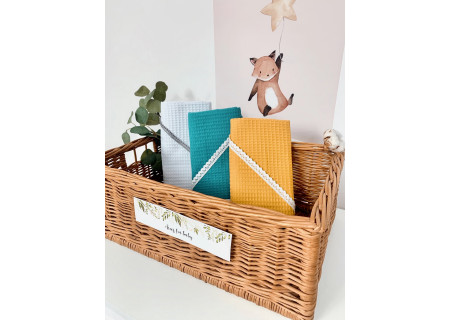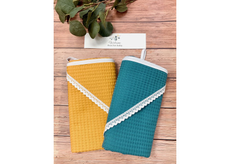 Okrycie kąpielowe z kapturkiem z nowej kolekcji Boho to produkt, który idealnie sprawdzi się, gdy chcemy owinąć dziecko po kąpieli. Jako bazę wykorzystaliśmy 100% bawełnę, tkaną w taki sposób aby powstał splot przypominający strukturę wafelka. Dzięki zastosowaniu tego wyjątkowego splotu, okrycie staje się bardziej chłonne. Obszerne kapturki ozdobiliśmy elegancką koronką lub pomponikami . Postawiliśmy na duży rozmiar 100×100cm, aby owinięcie dziecka było jeszcze łatwiejsze.