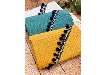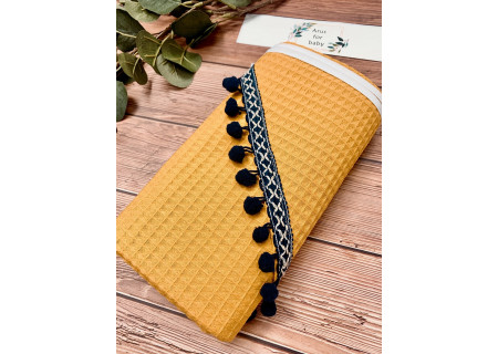 Okrycie kąpielowe 100x100 Boho collection navy blue pompons mustard
