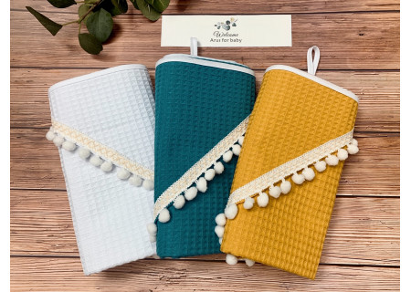 Okrycie kąpielowe z kapturkiem z nowej kolekcji Boho to produkt, który idealnie sprawdzi się, gdy chcemy owinąć dziecko po kąpieli. Jako bazę wykorzystaliśmy 100% bawełnę, tkaną w taki sposób aby powstał splot przypominający strukturę wafelka. Dzięki zastosowaniu tego wyjątkowego splotu, okrycie staje się bardziej chłonne. Obszerne kapturki ozdobiliśmy elegancką koronką lub pomponikami . Postawiliśmy na duży rozmiar 100×100cm, aby owinięcie dziecka było jeszcze łatwiejsze.