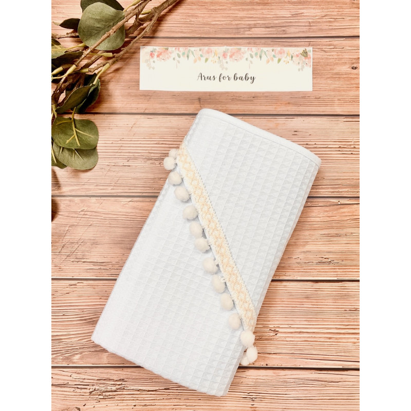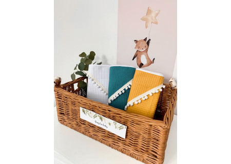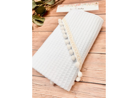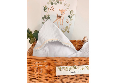 Okrycie kąpielowe z kapturkiem z nowej kolekcji Boho to produkt, który idealnie sprawdzi się, gdy chcemy owinąć dziecko po kąpieli. Jako bazę wykorzystaliśmy 100% bawełnę, tkaną w taki sposób aby powstał splot przypominający strukturę wafelka. Dzięki zastosowaniu tego wyjątkowego splotu, okrycie staje się bardziej chłonne. Obszerne kapturki ozdobiliśmy elegancką koronką lub pomponikami . Postawiliśmy na duży rozmiar 100×100cm, aby owinięcie dziecka było jeszcze łatwiejsze.