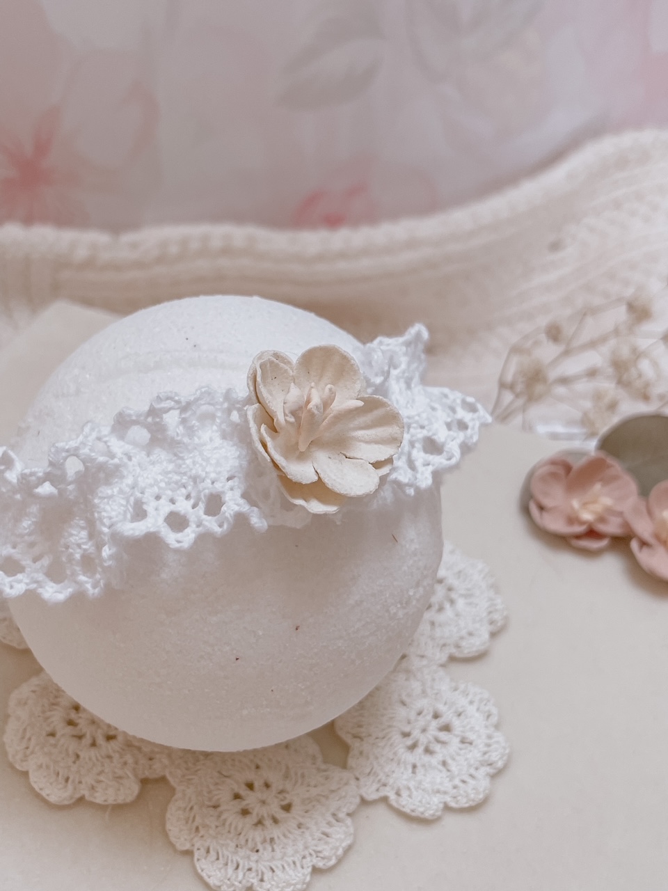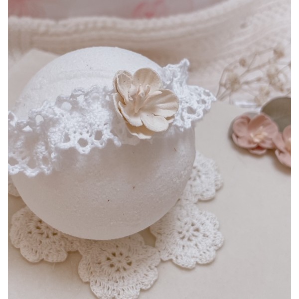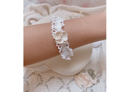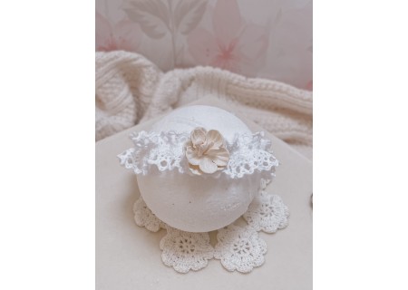 Opaska dla niemowląt i dzieci wykonana z bawełnianej koronki, układającej się w falbankę. Ozdoba na główkę niemowlaka została ozdobiona subtelnym kwiatuszkiem.