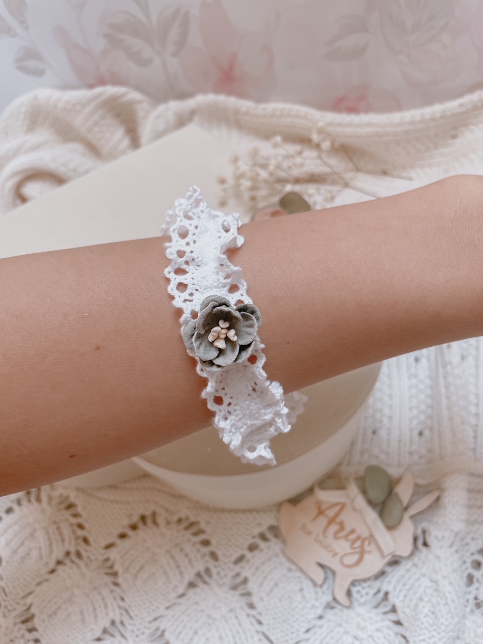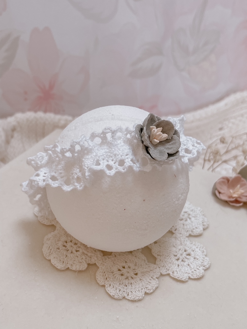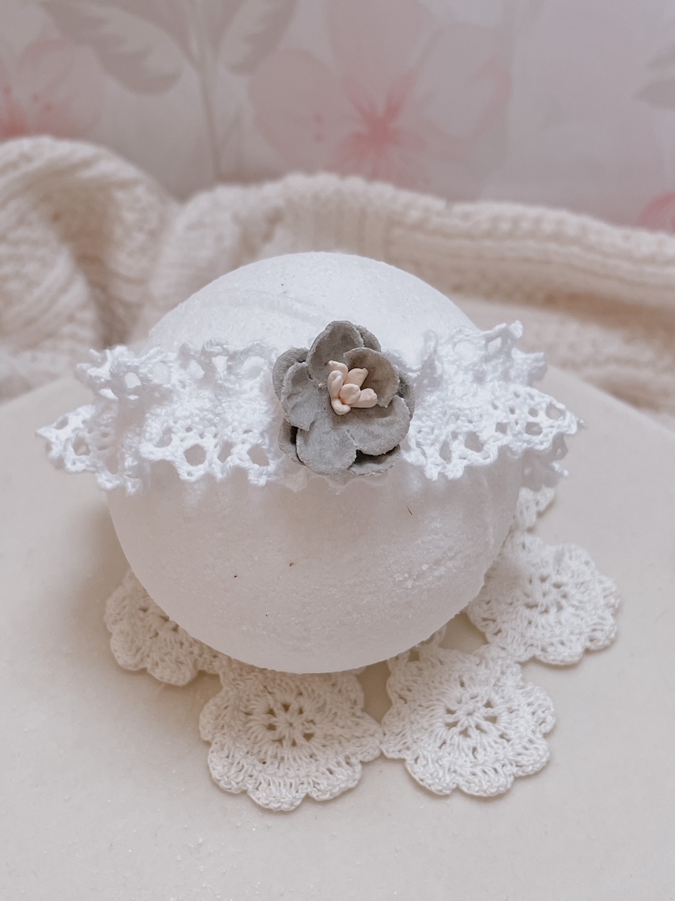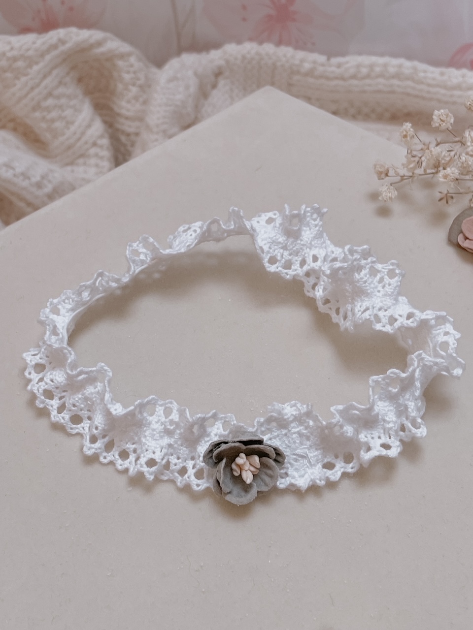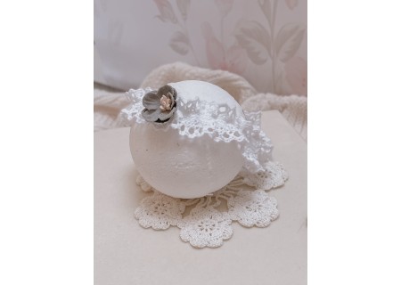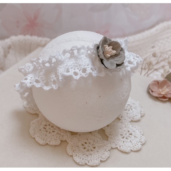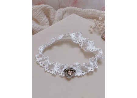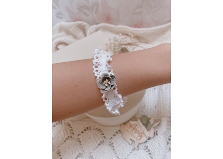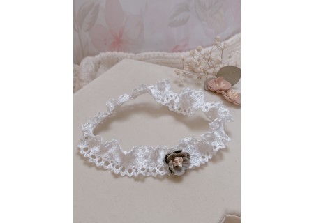 Opaska dla niemowląt i dzieci wykonana z bawełnianej koronki, układającej się w falbankę. Ozdoba na główkę niemowlaka została ozdobiona subtelnym kwiatuszkiem.