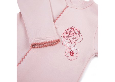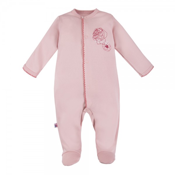 Pajac niemowlęcy różowy z kolekcji "Roses" uszyty z miękkiej i przyjemnej w dotyku dzianiny bawełnianej. Elementem ozdobym jest obrazek róży z napisem "Vintage" oraz rękawki ozdobione kroszetką. Krój umożliwia całkowite rozpięcie, przez co ubranko jest funkcjonalne i wygodne. Przy zapięciu wszyta urocza falbanka. Pajac wykończony jest miękką lamówką. Pajace niemowlęce idealnie sprawdzają się w pierwszych miesiącach życia dziecka. Wykorzystywany jako ubranko do spania lub wyjściowe.
