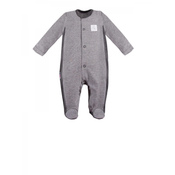 Pajac niemowlęcy z kolekcji "Unique" uszyty z miękkiej i przyjemnej w dotyku dzianiny bawełnianej w paseczki. Z przodu pajacyka znajduje naszywka. Krój umożliwia całkowite rozpięcie, przez co ubranko jest funkcjonalne i wygodne. Pajac wykończony jest lamówką. Pajace niemowlęce idealnie sprawdzają się w pierwszych miesiącach życia dziecka. Wykorzystywany jako ubranko do spania lub wyjściowe.
