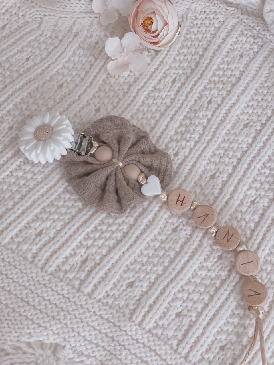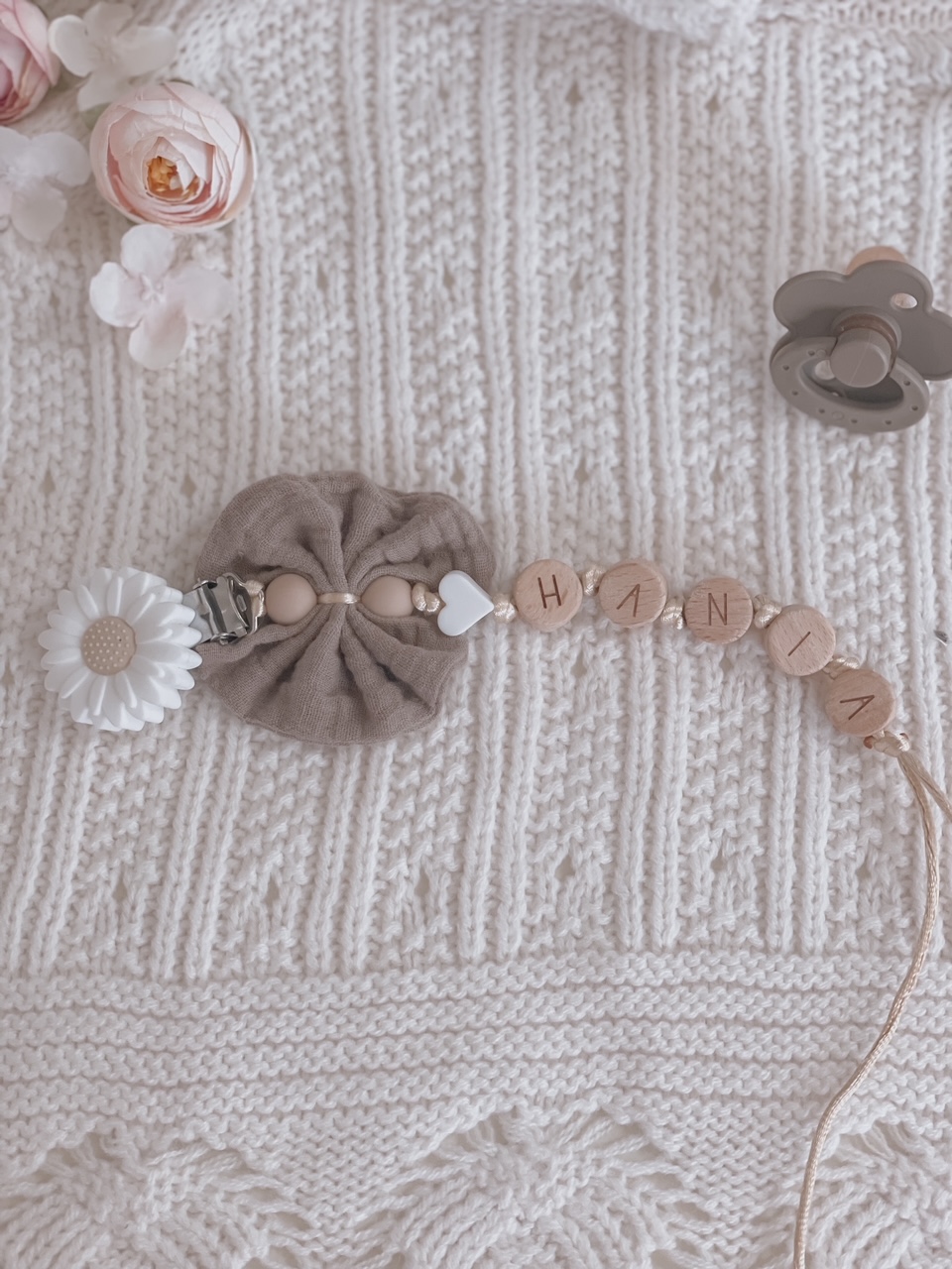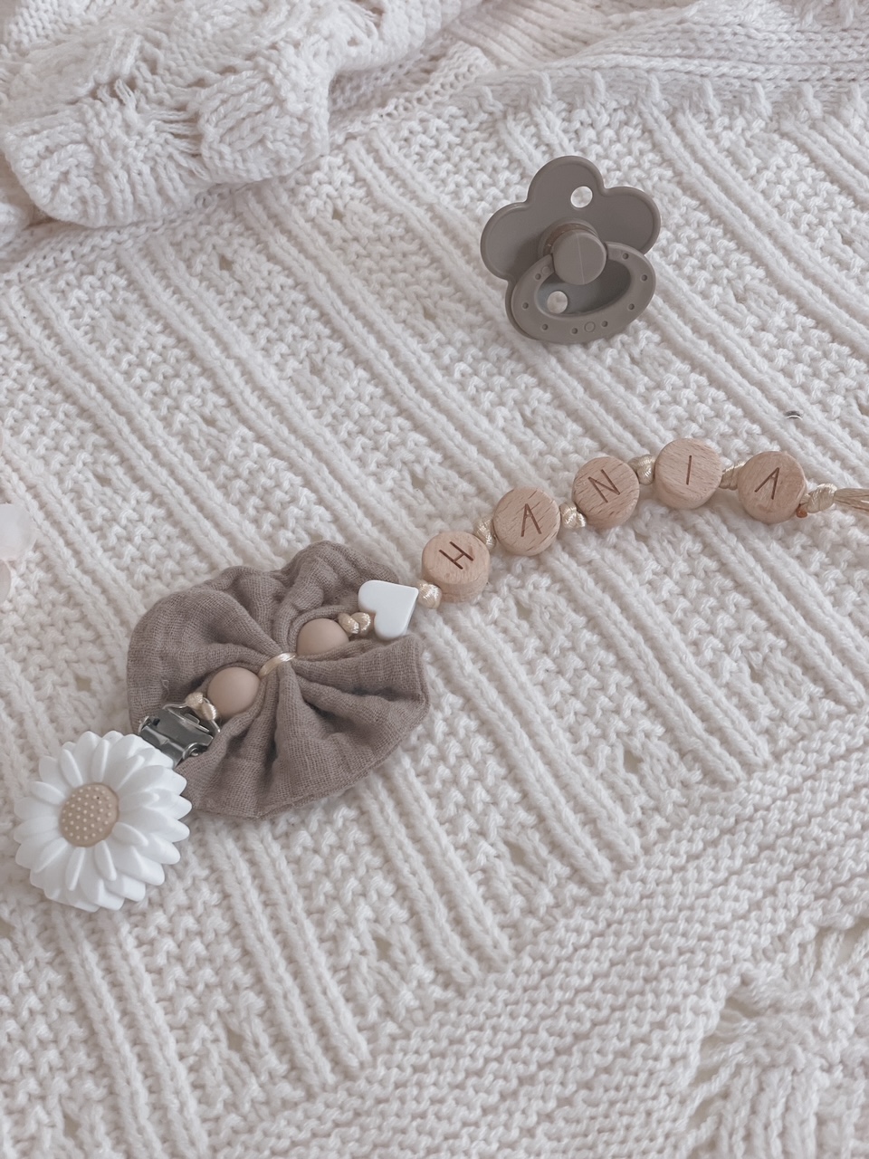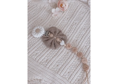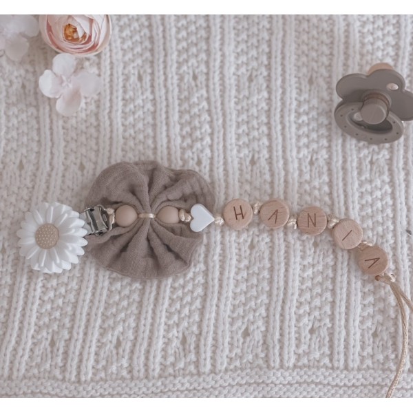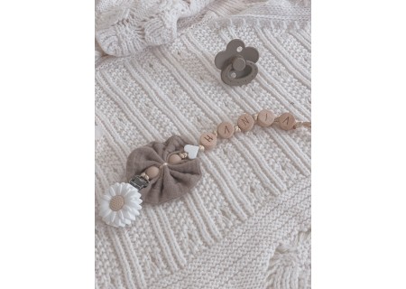 Personalizowana zawieszka HANDMADE do smoczka z muślinową kokardką w kolorze brązowym