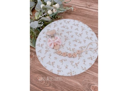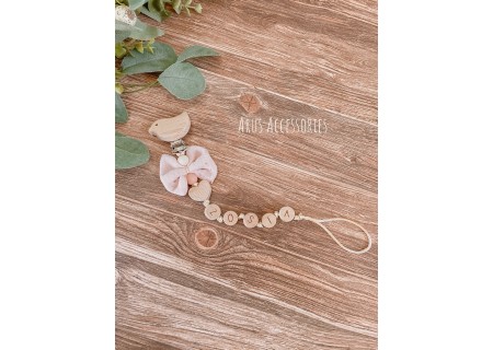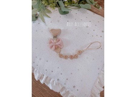 Personalizowana zawieszka HANDMADE do smoczka z muślinową kokardką w kolorze brzoskwiniowym