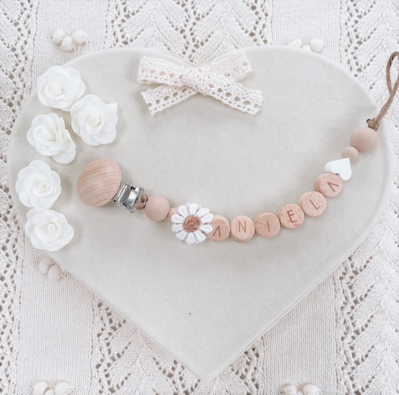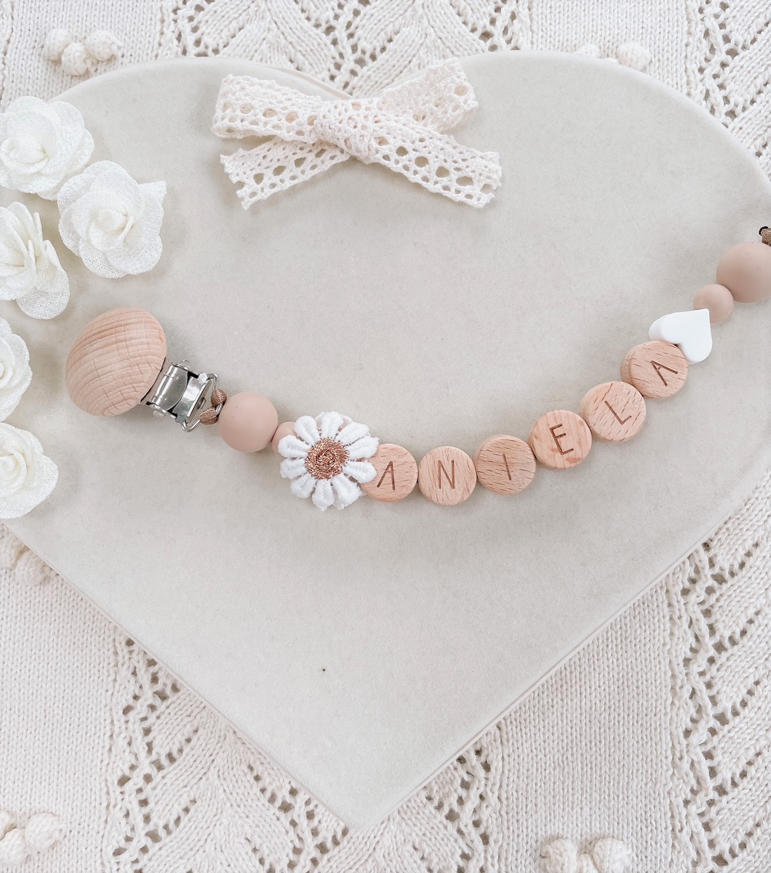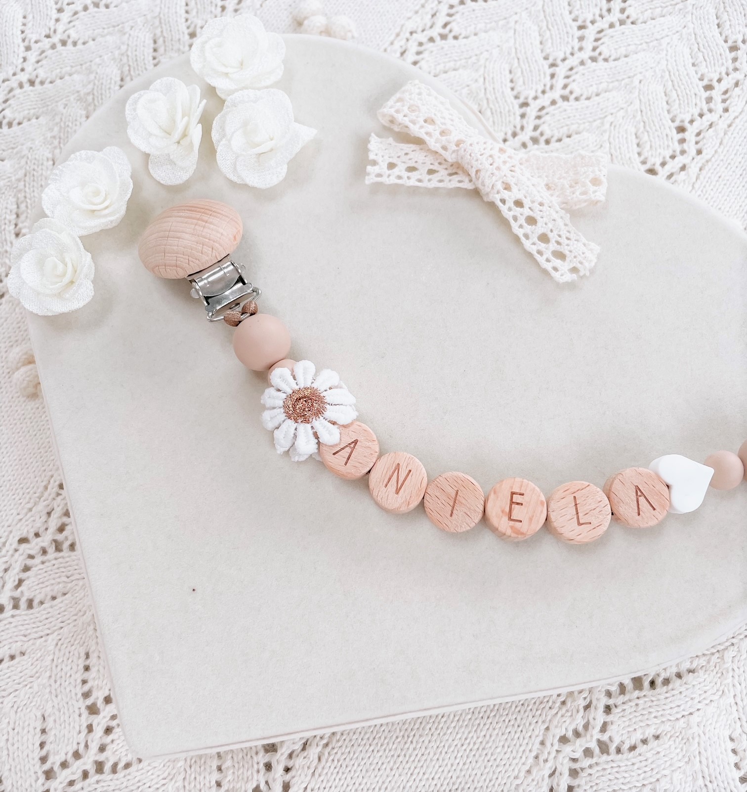 Personalizowana zawieszka HANDMADE do smoczka z muślinową kokardką w kolorze beżowym
