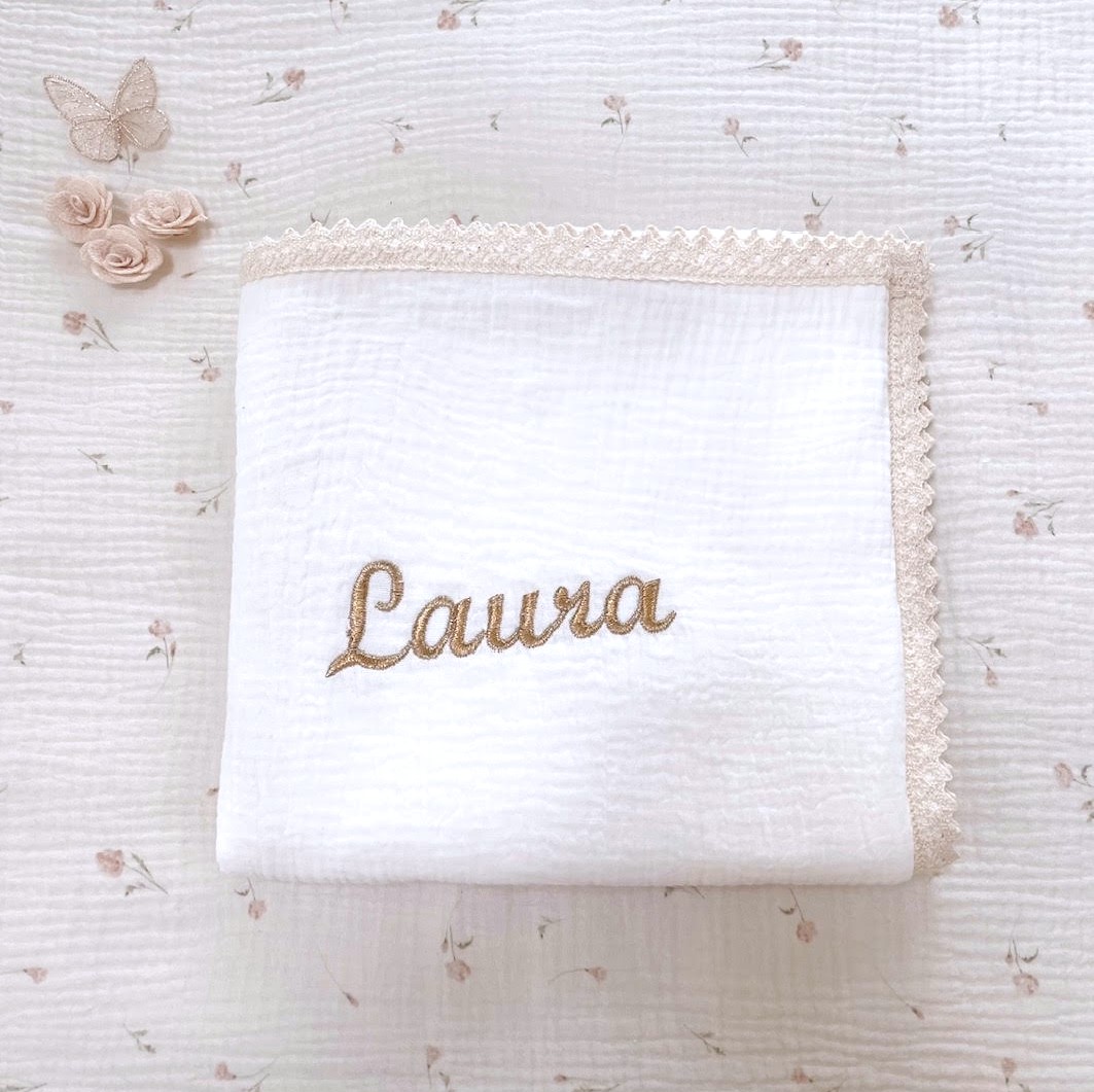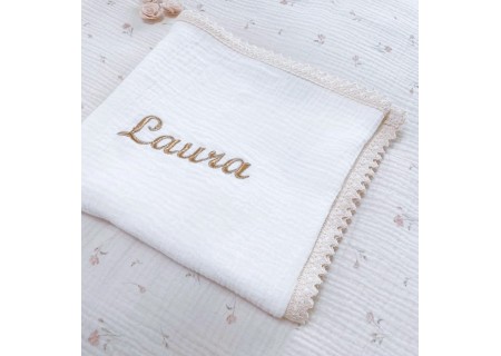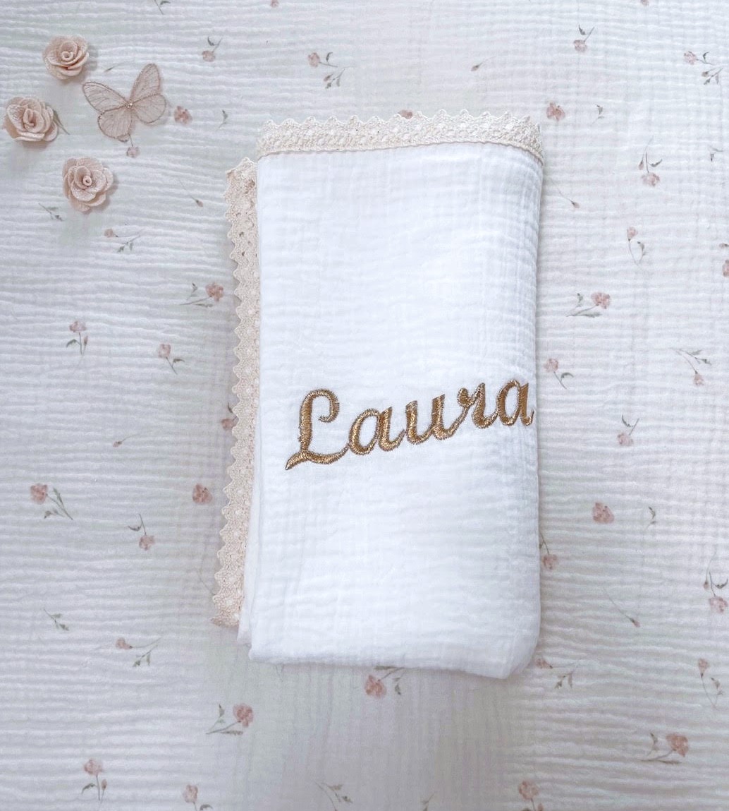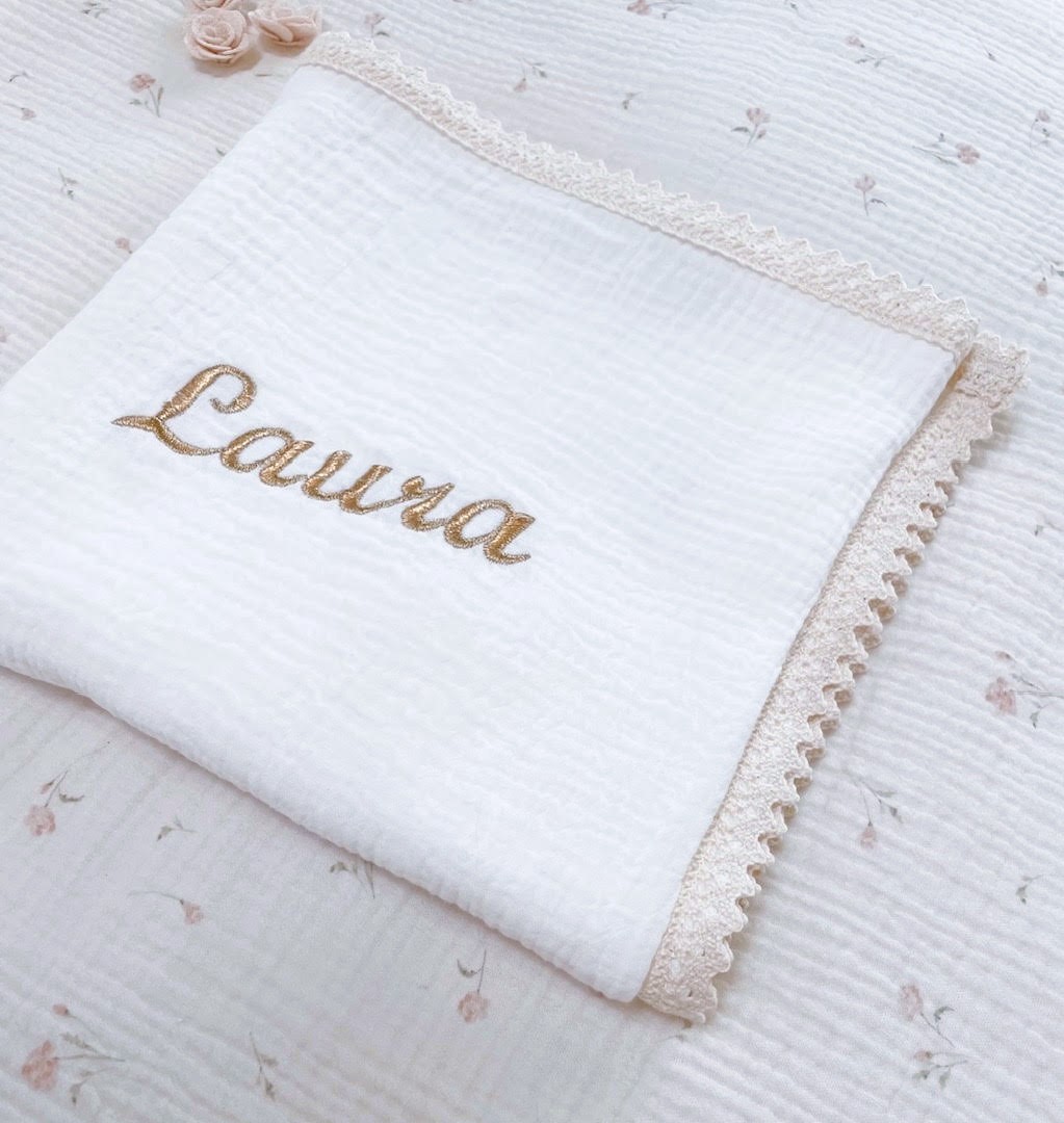 Haft personalizowany w kolorze złotym, idealnie wkomponowany w romantyczny styl kocyka.