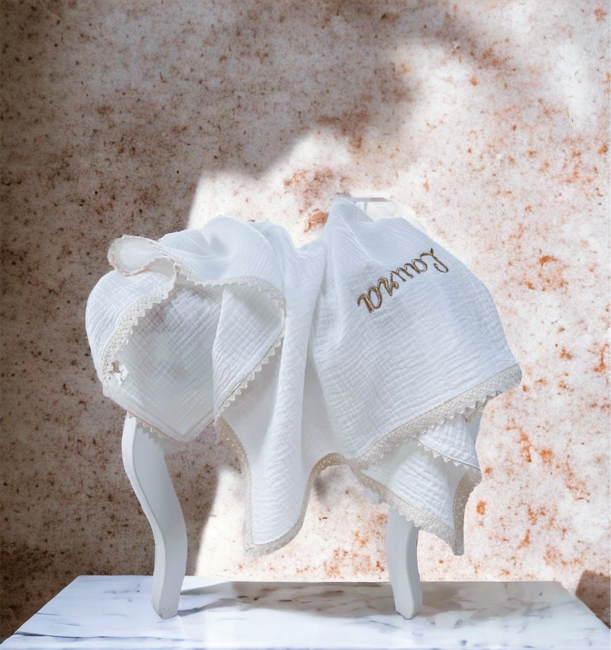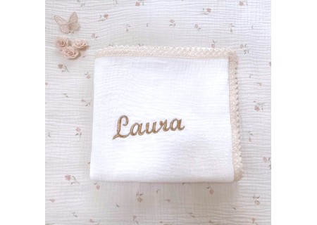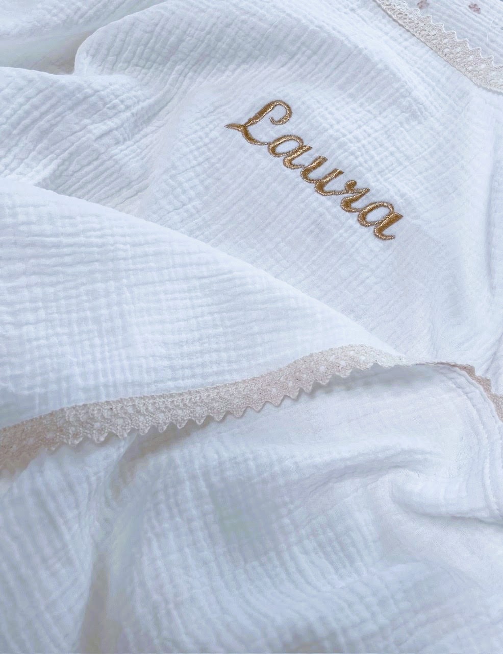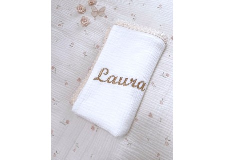 Haft personalizowany w kolorze złotym, idealnie wkomponowany w romantyczny styl kocyka.