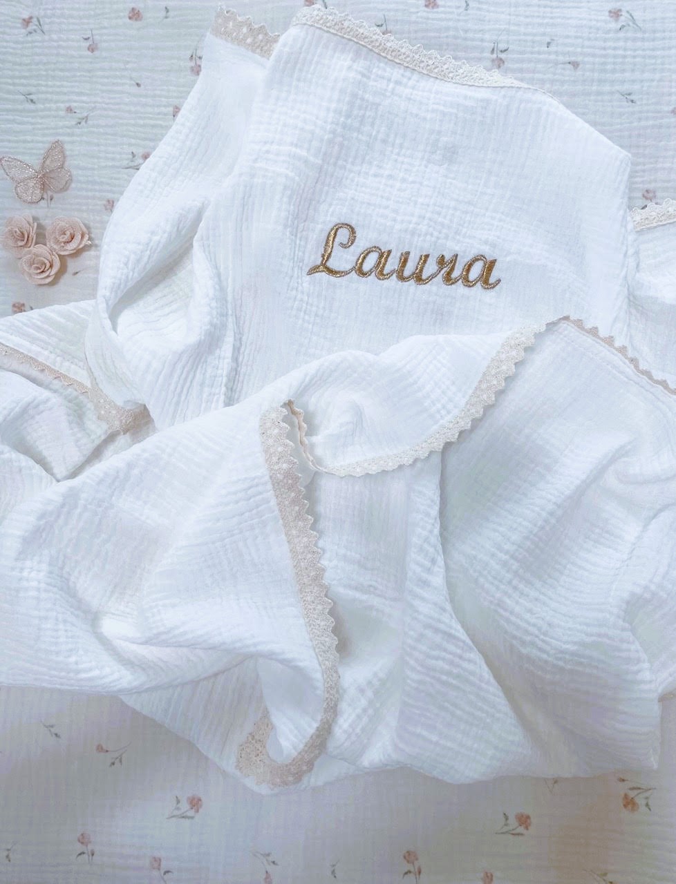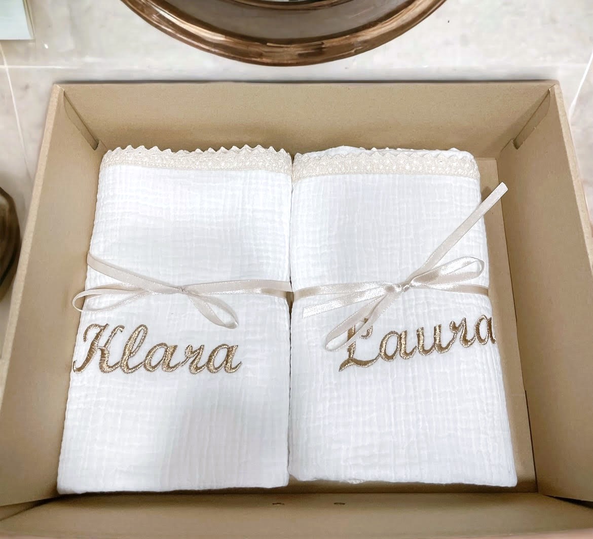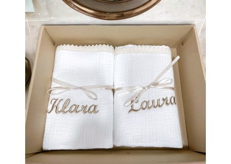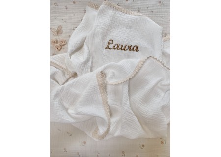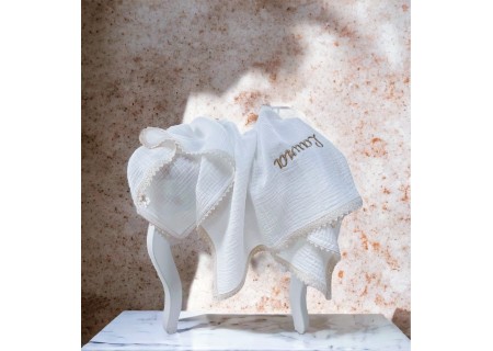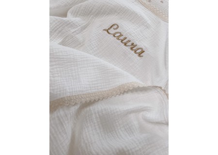 PERSONALIZOWANY KOCYK Z KRESZOWANEJ MUŚLINY OZDOBIONY KORONKĄ I GUSTOWNYM HAFTEM