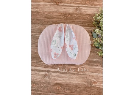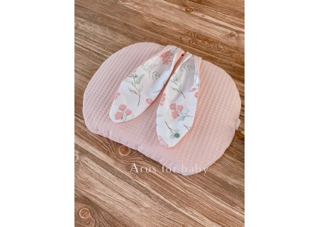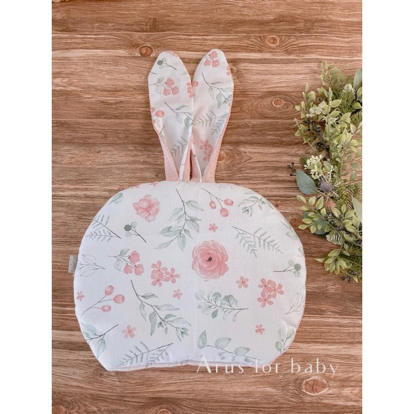 Poduszka o płaskiej formie z długimi uszami stylizowana na zajączka. Dwustronna, z jednej strony wzorzysta tkanina bawełniana, z drugiej wafelek.
