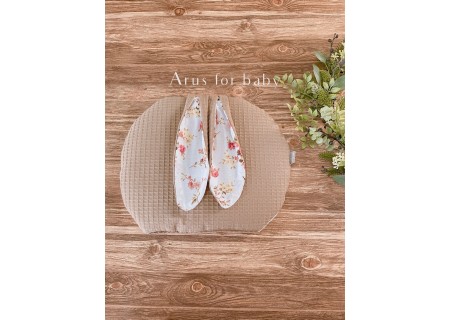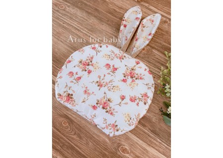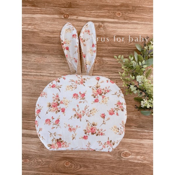 Poduszka o płaskiej formie z długimi uszami stylizowana na zajączka. Dwustronna, z jednej strony wzorzysta tkanina bawełniana, z drugiej wafelek.