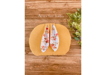 Poduszka o płaskiej formie z długimi uszami stylizowana na zajączka. Dwustronna, z jednej strony wzorzysta tkanina bawełniana, z drugiej wafelek.