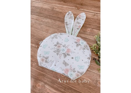 Poduszka o płaskiej formie z długimi uszami stylizowana na zajączka. Dwustronna, z jednej strony wzorzysta tkanina bawełniana, z drugiej wafelek.