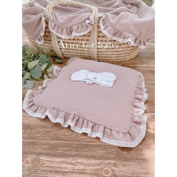 Poduszka z kolekcji Premium Eco Muslin w rozmiarze 40x40. Poszewka na poduszkę z trzech stron obszyta falbanką z koronkowym wykończeniem, na jednej ze stron znajduje się kryty zamek.