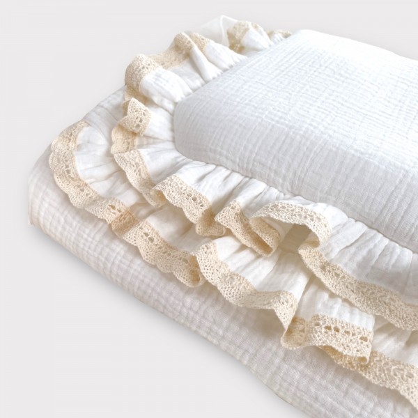 wykonana w 100% z muślinu kreszowanego bawełnianego tzw doubble gauze. Tkaniny w 100% z naturalne bawełniane, certyfikat Oeko-Tex Standard 100 i.