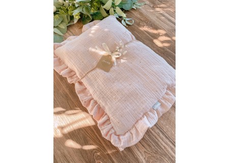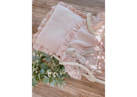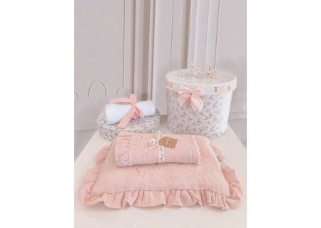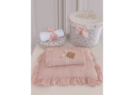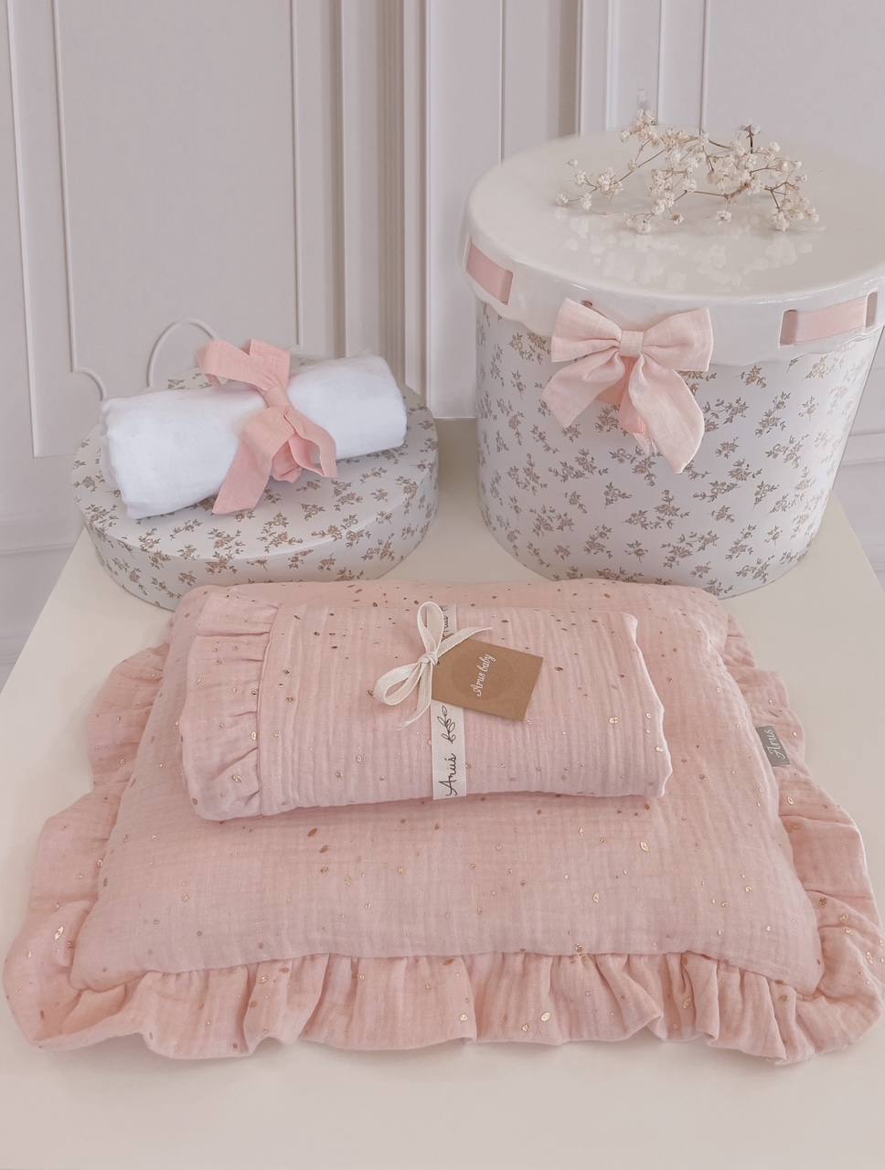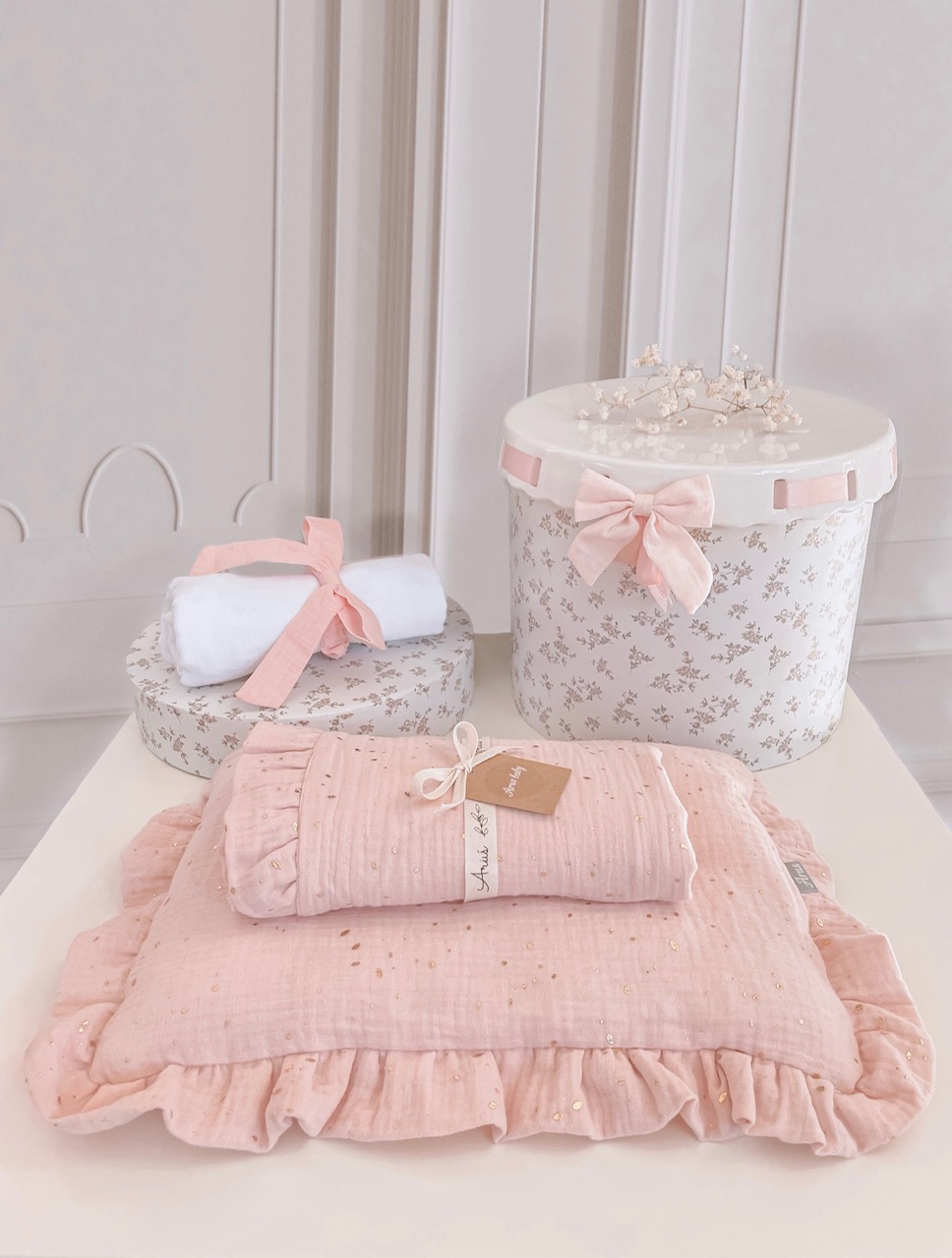 W komplecie poduszka o rozmiarze 25 x 35 cm + czterowarstwowy otulacz,/ kocyk o rozmiarze 50 x 70 cm (+-2 cm).