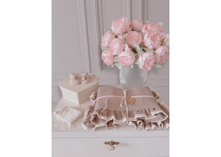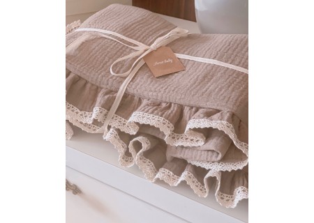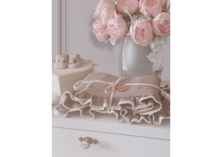 Otulacz/ kocyk od góry wykończony falbanką z koronką.