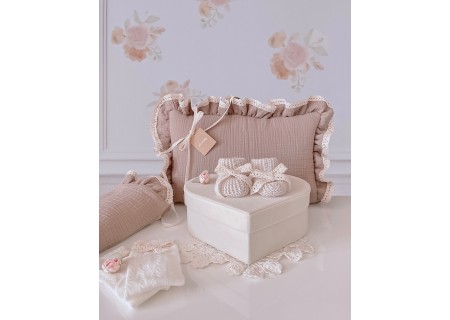 Poduszka z trzech stron posiada falbanki wykończone bawełnianą koronką.
