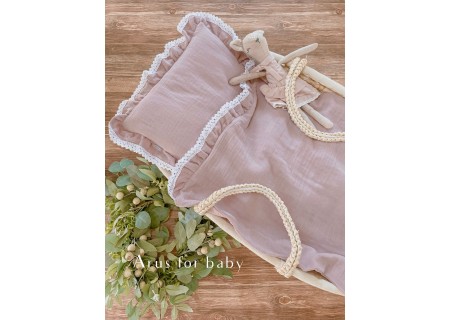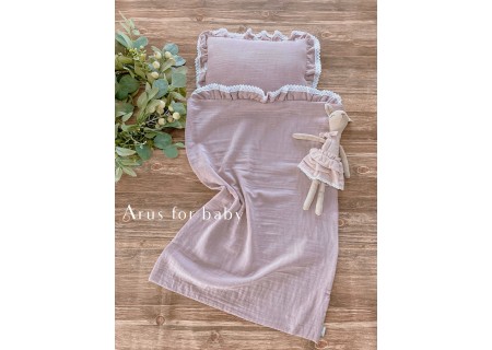 W komplecie poduszka o rozmiarze 25 x 35 cm + czterowarstwowy otulacz,/ kocyk o rozmiarze 50 x 70 cm (+-2 cm).