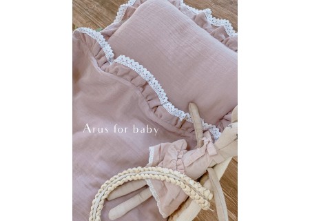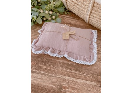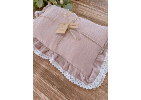 Poduszka z trzech stron posiada falbanki wykończone bawełnianą koronką.