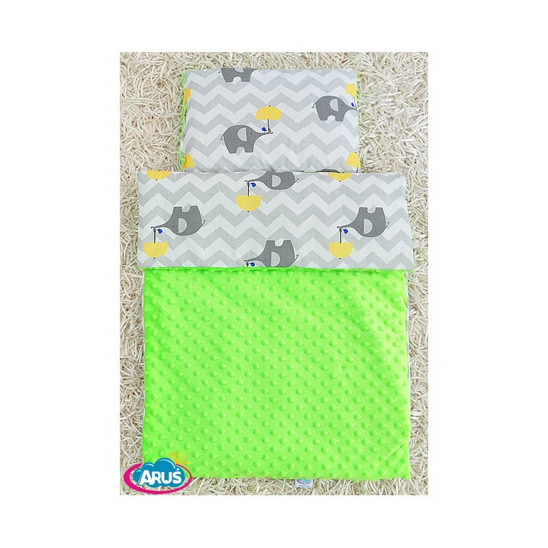 Pościel do wózka / kołyski MINKY (zielony+słonik z żółtą parasolką)