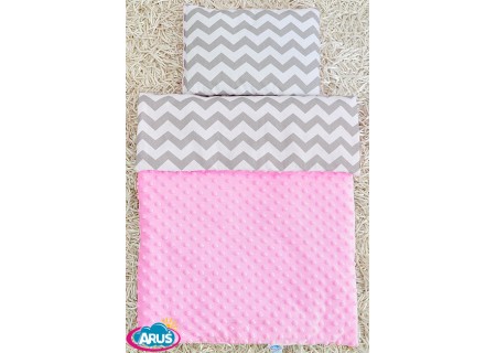 1. Poszewka na kołderkę 120 x 90cm -zapinana za bezpieczny suwaczek, tkanina 100%bawełna atestowana, Poszewka stanowi połączenie gładkiej tkaniny z uroczą tkaniną w drobną krateczkę. Połączenie tkaniny gładkiej z krateczką uwidocznione jest ciemniejszą wypustką. Uzupełnieniem całości jest śliczny duży hafcik znajdujący się również na innych elementach zestawu