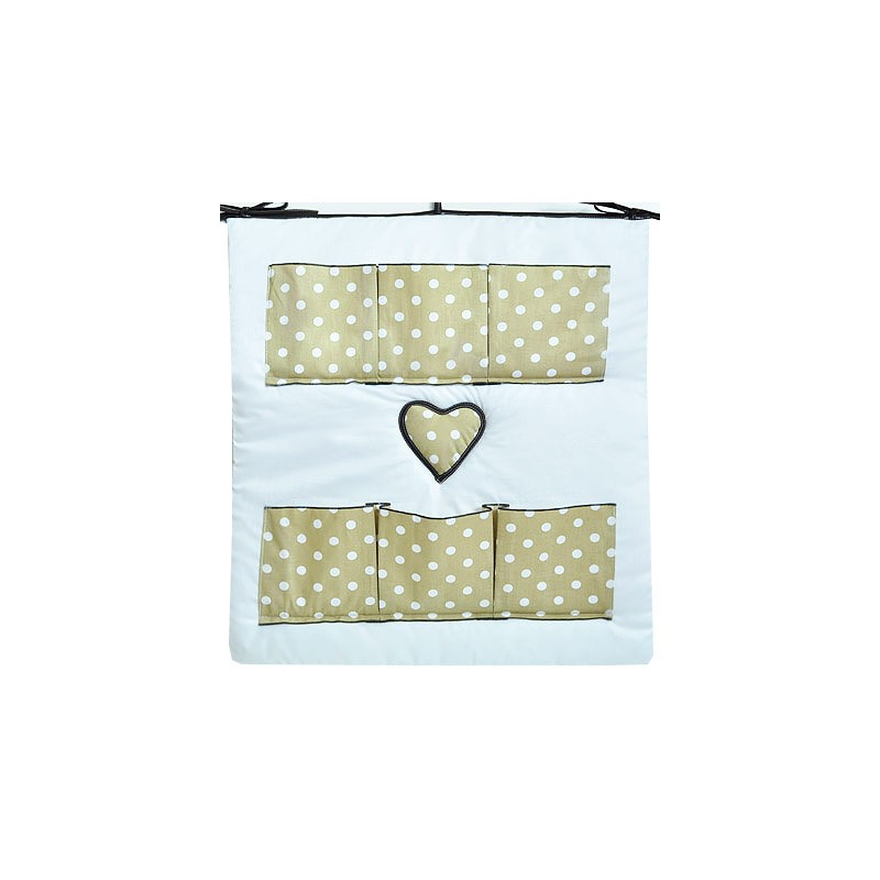 Nasz przybornik to urocze połączenie materiału gładkiego z grochami – doskonale pasuje również do pościeli dostępnych w naszym sklepie internetowym. Przybornik posiada 6 pojemnych kieszonek z zakładkami oraz urocze serduszka, które dodają niezwykłego piękna temu dodatkowi. Wszyte 3 troczki znajdują się na górze i służą do zawiązania przybornika w dowolnym miejscu na łóżeczku.