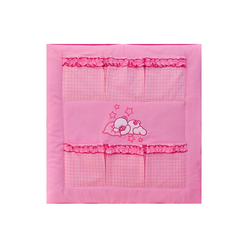 Przybornik ma 6 pojemnych kieszonek z zakładkami. Znajdujące się na górze przybornika 3 troczki służą do zawiązania go w dowolnym miejscu na łóżeczku.