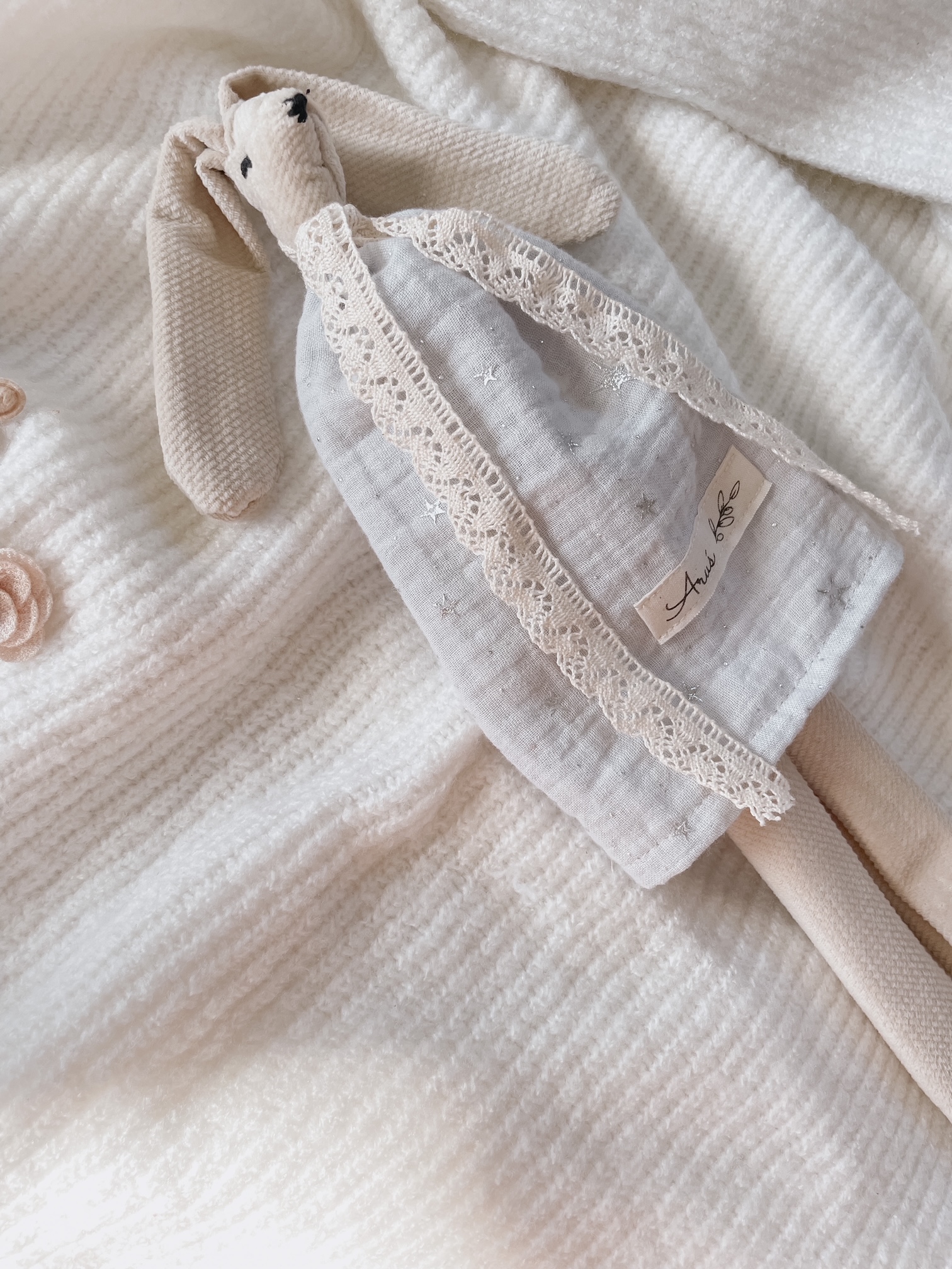Przytulanka posiada długie uszy idealnie dopasowujące się do małej rączki niemowlaka.