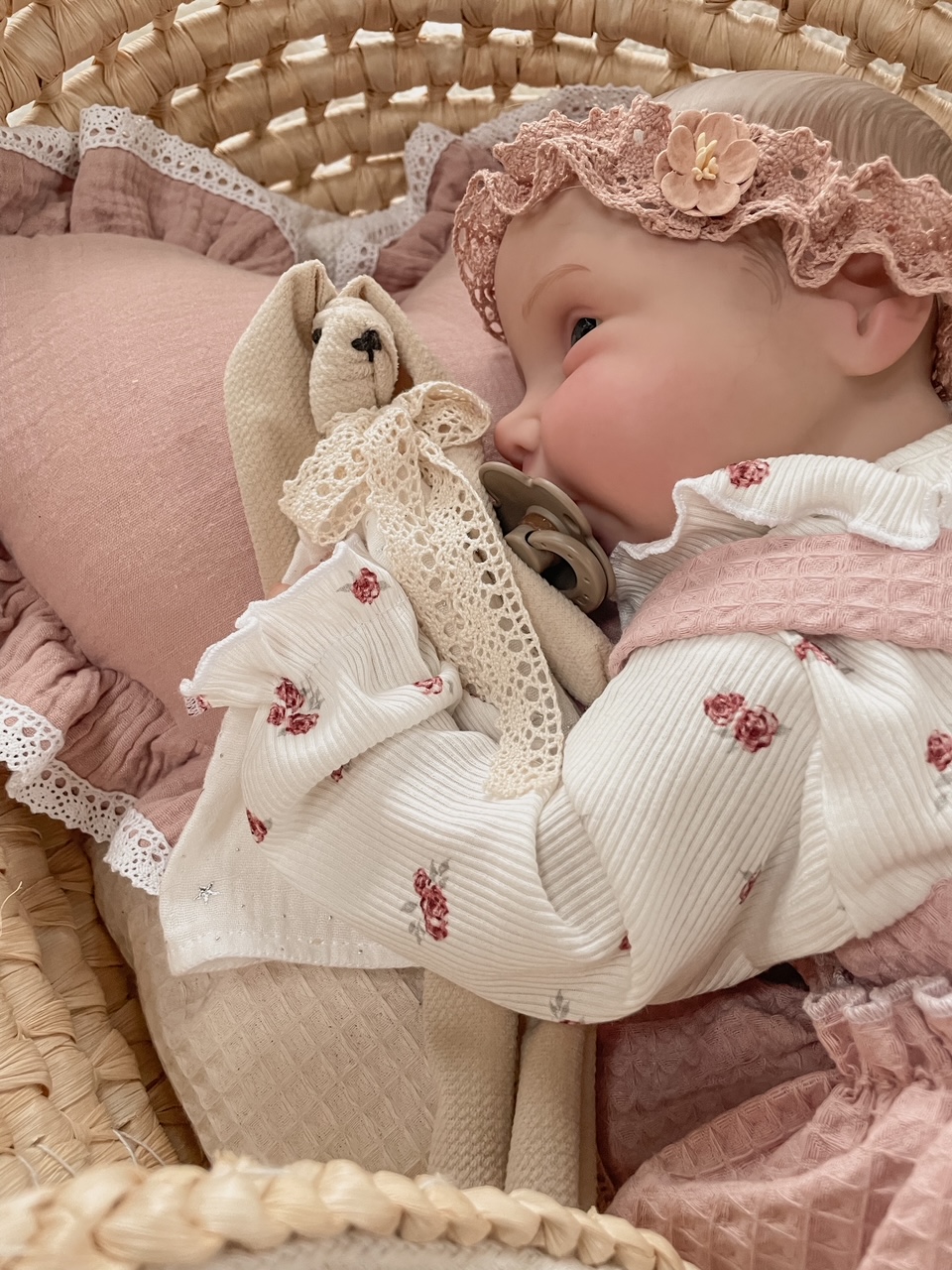 Wykonana z wysokogatunkowych i certyfikowanych tkanin -muślinu bawełnianego, velvetu oraz bawełnianej koronki.