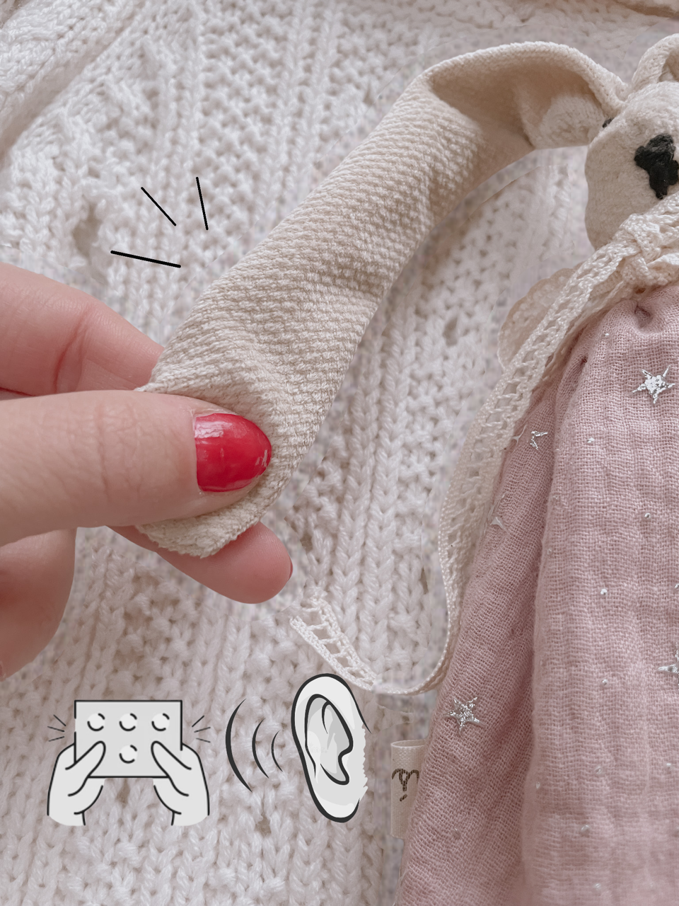 W uszkach oraz nóżkach zajączek posiada umiejscowione sensorki, naturalne pestki i elementy szeleszczące stymulujące rozwój bodźców układu zmysłów.