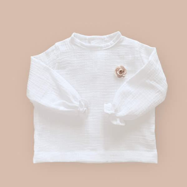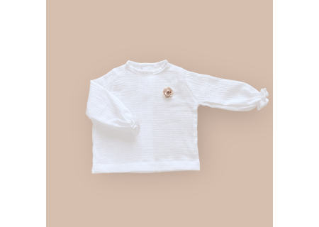 Muślinowa koszula ozdobiona materiałową różyczką z nowej kolekcji, uszyta ze 100% muślinu bawełnianego , z tyłu zapinana na drewniane guziczki. Niezwykle miękka w dotyku i komfortowa w noszeniu.