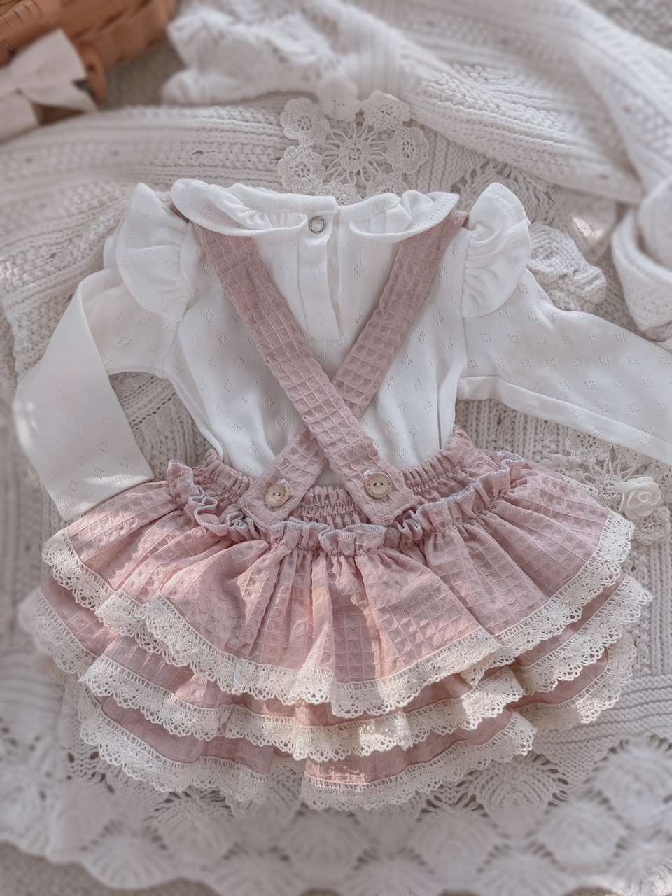 Dzięki zastosowaniu trzech falban z koronką, spódnica tworzy efekt "baleriny", który nie opada.