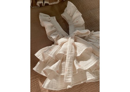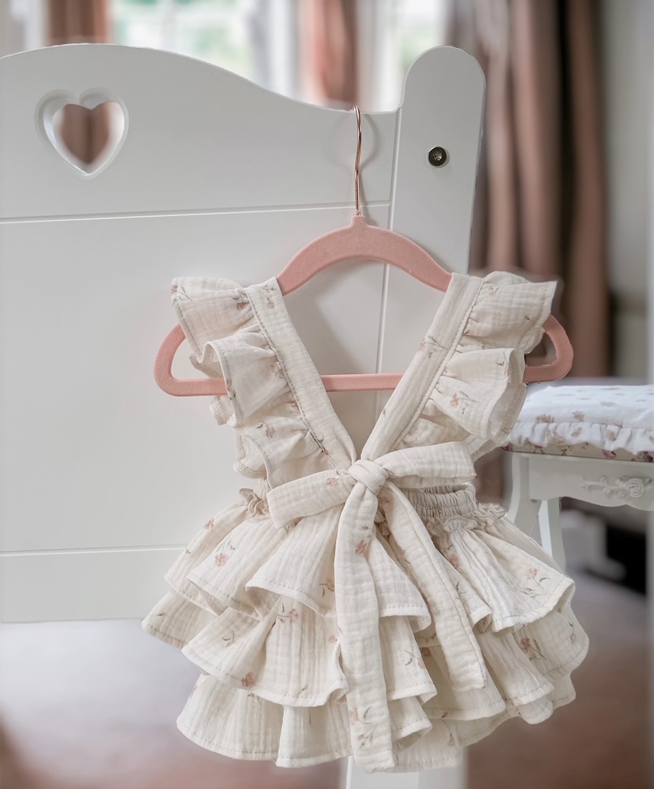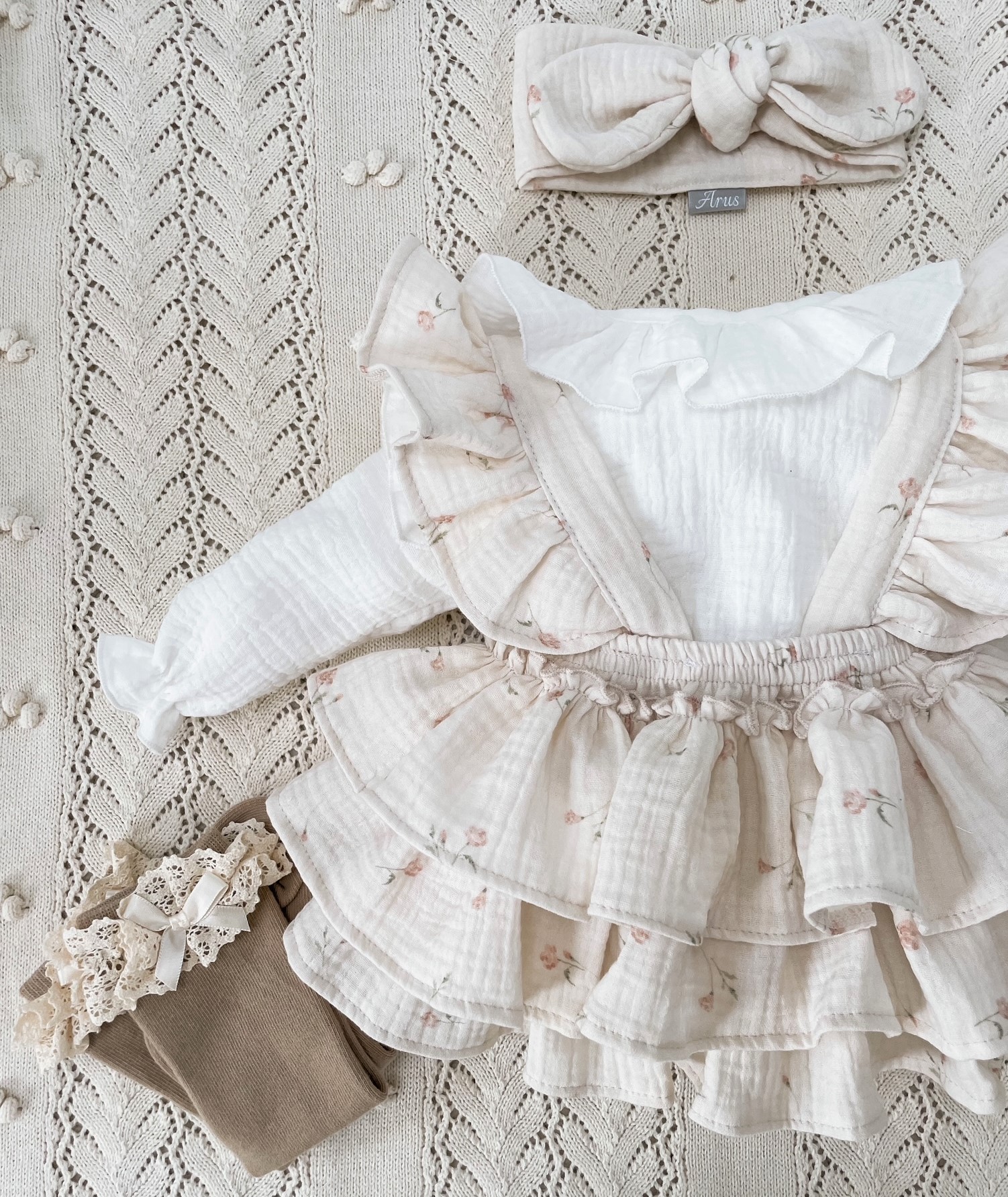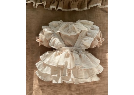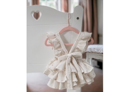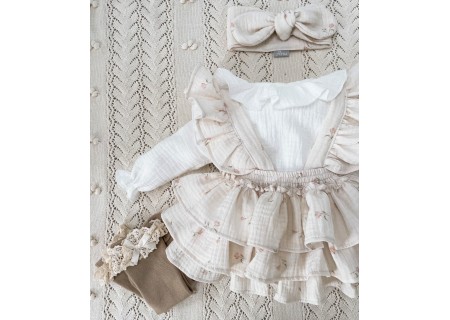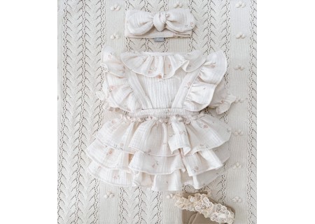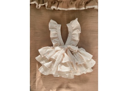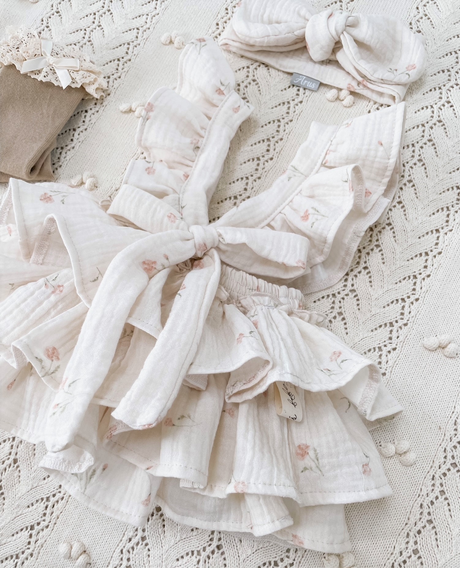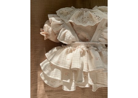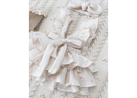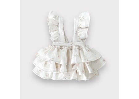 Spódniczka z trzech falban na szelkach uszyta z bawełnianego muślinu, wiązana z tyłu na kokardkę . Produkt posiada wszyte majteczki
