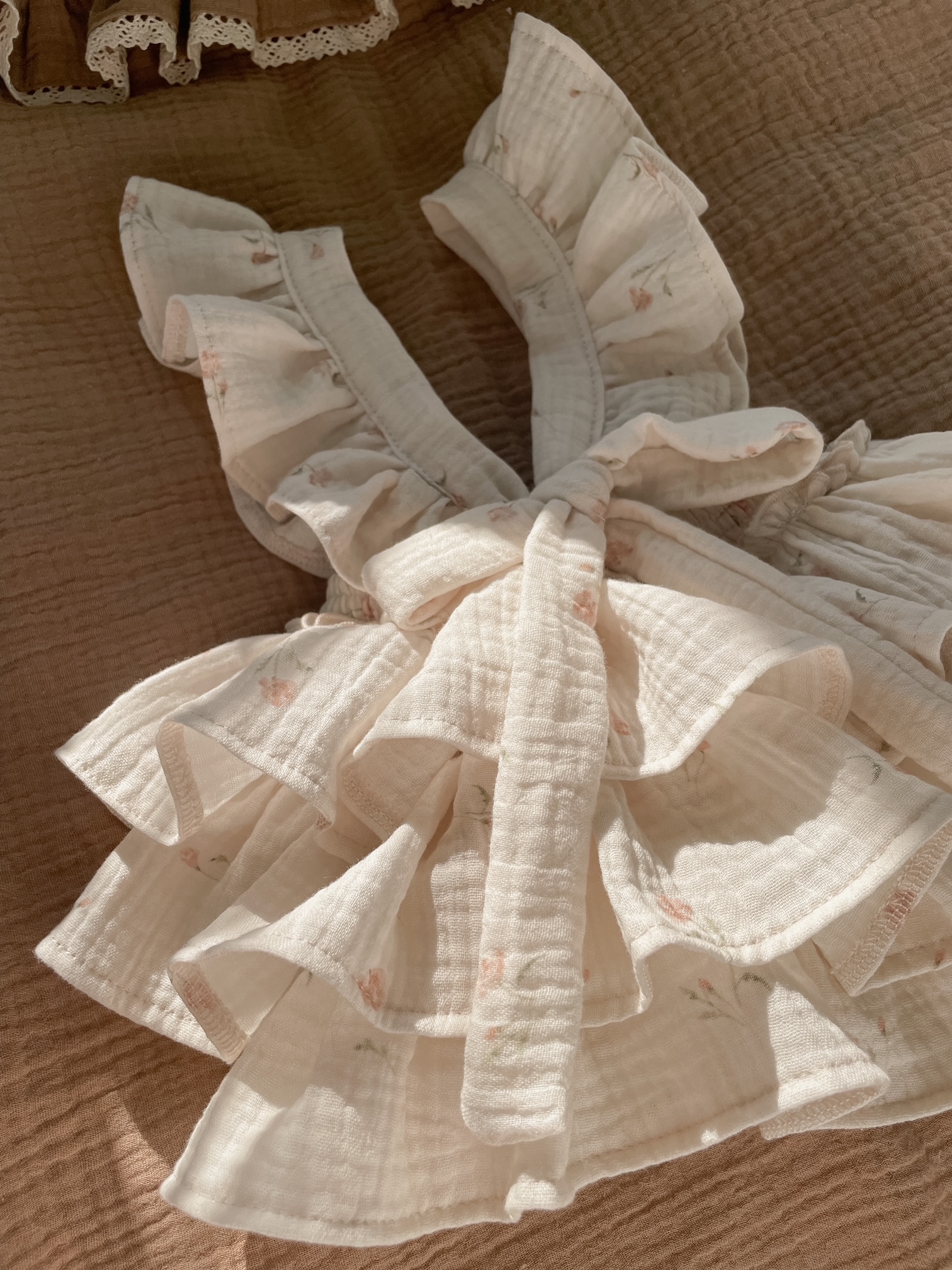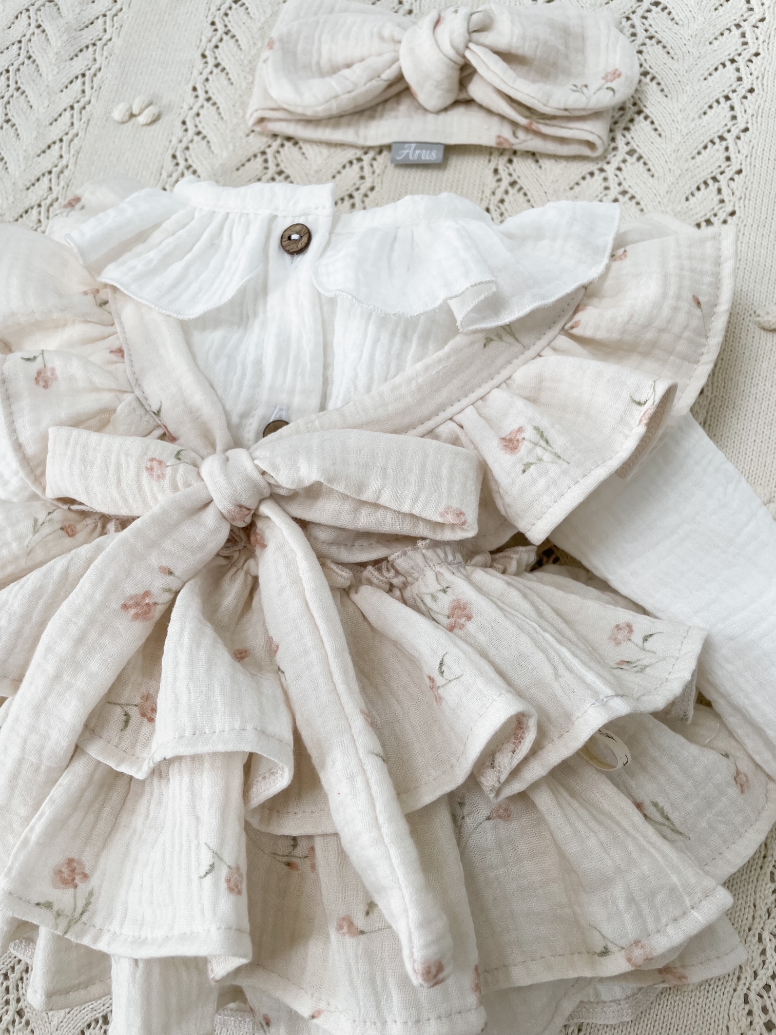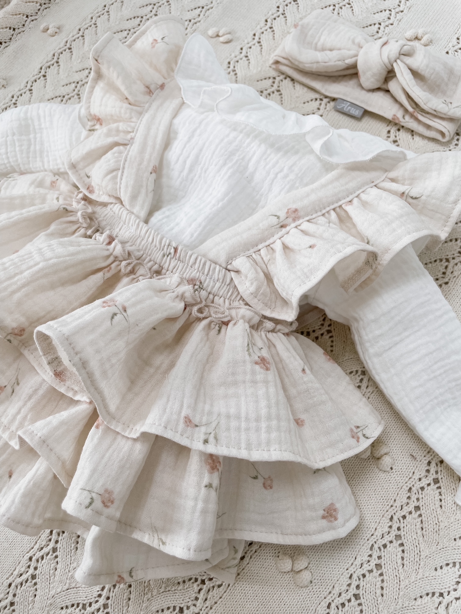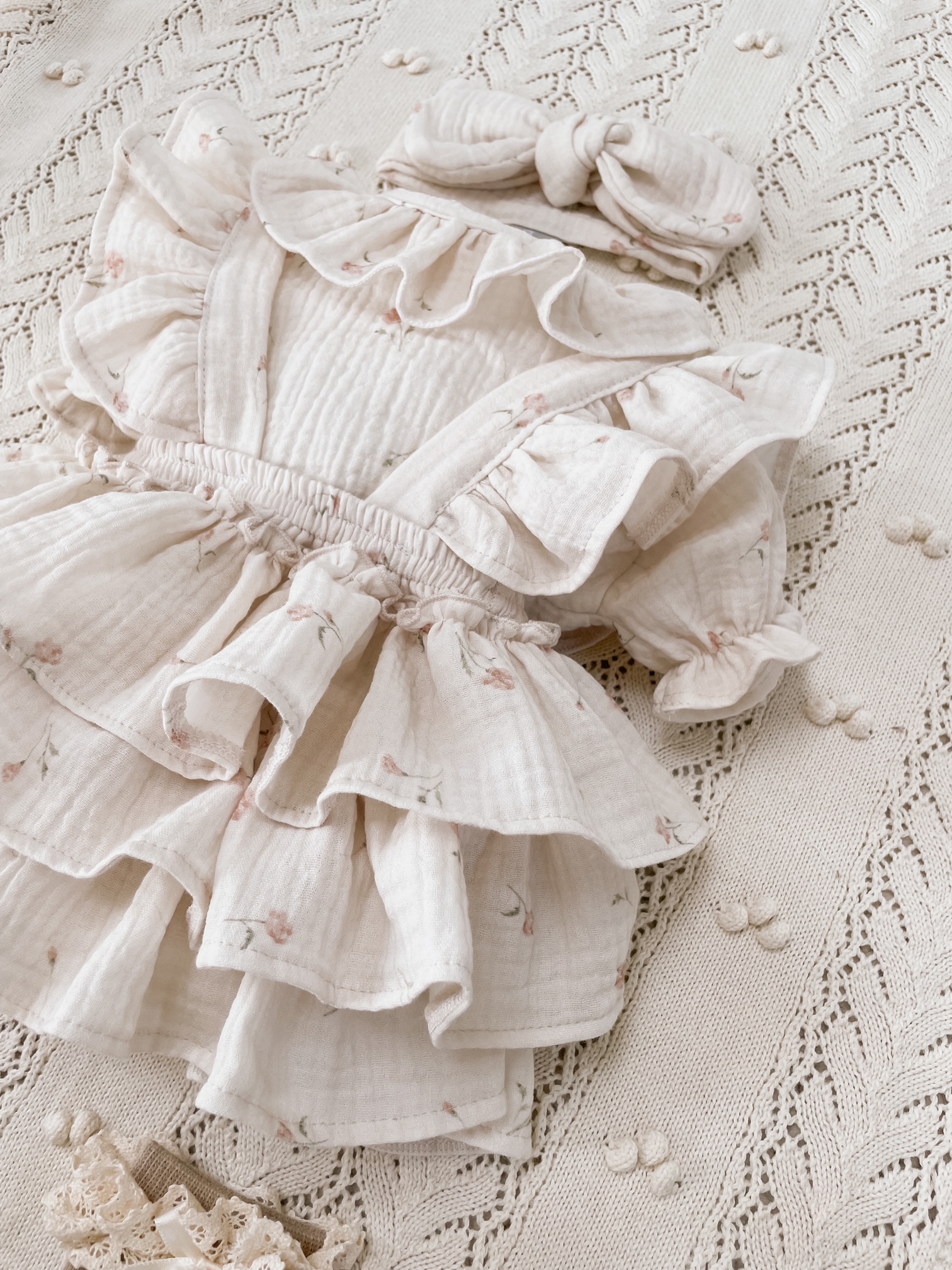 Spódniczka z trzech falban na szelkach uszyta z bawełnianego muślinu, wiązana z tyłu na kokardkę . Produkt posiada wszyte majteczki