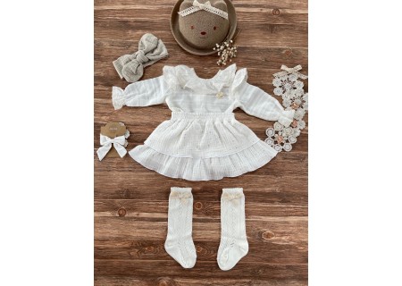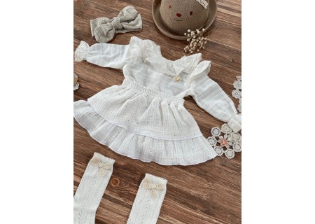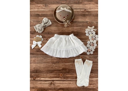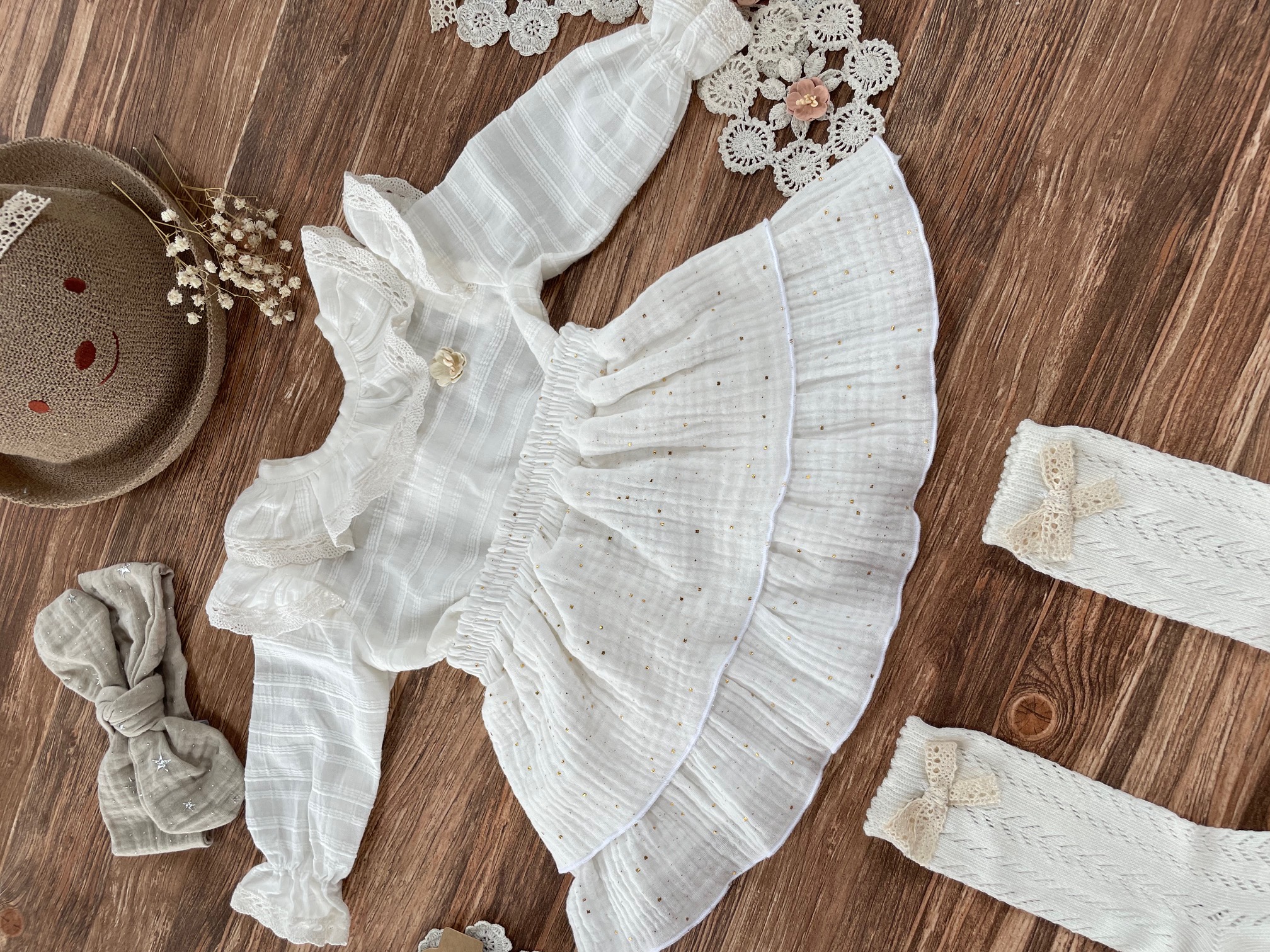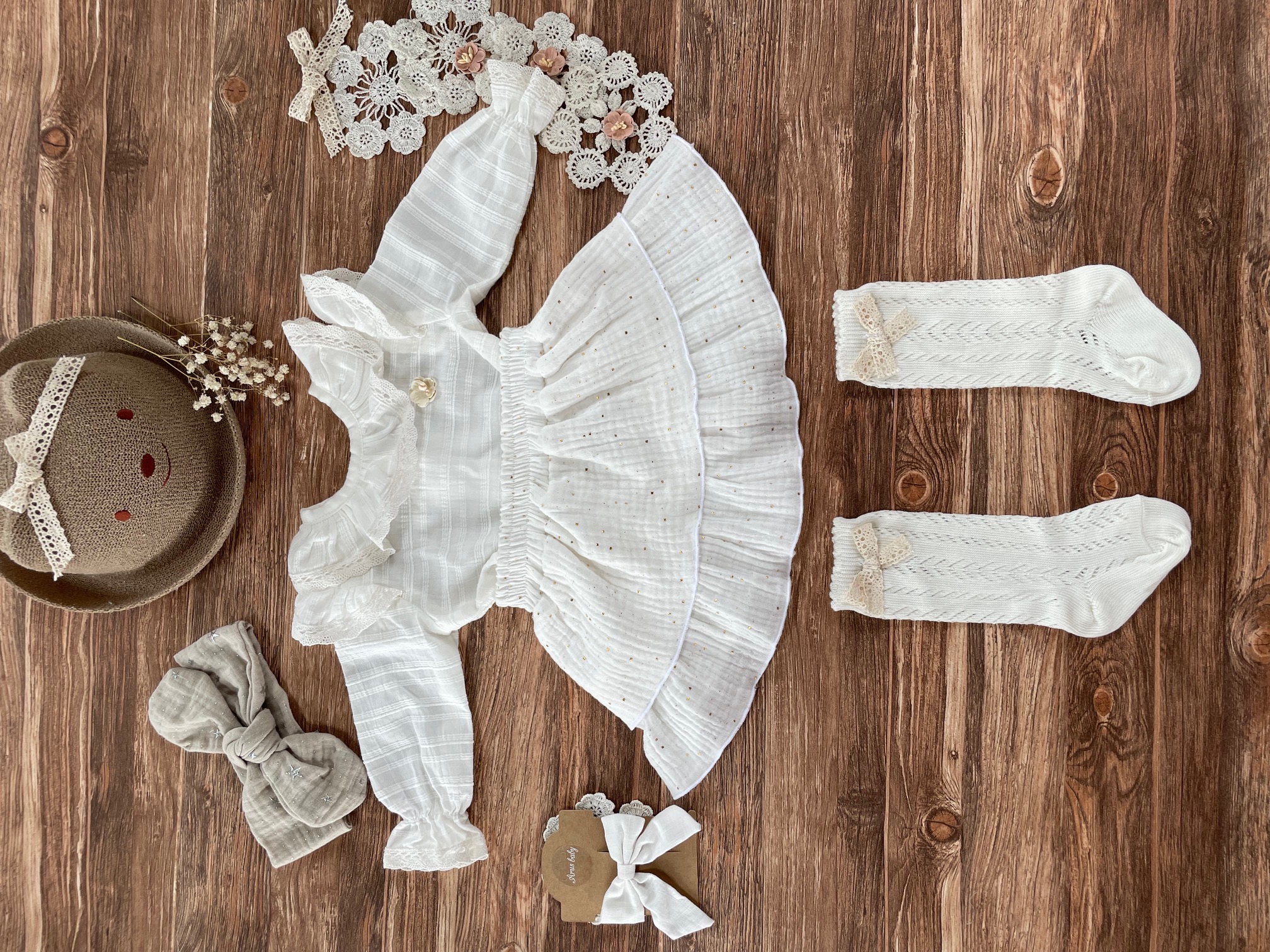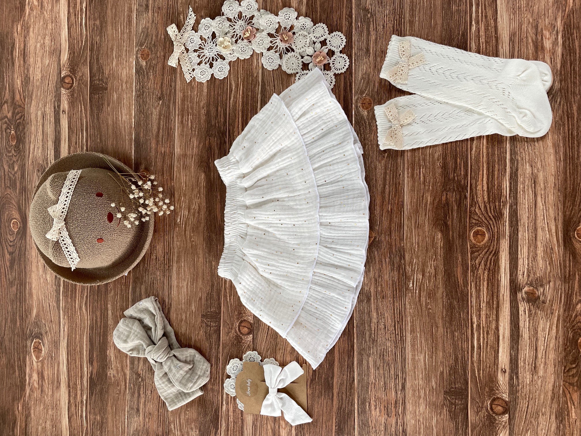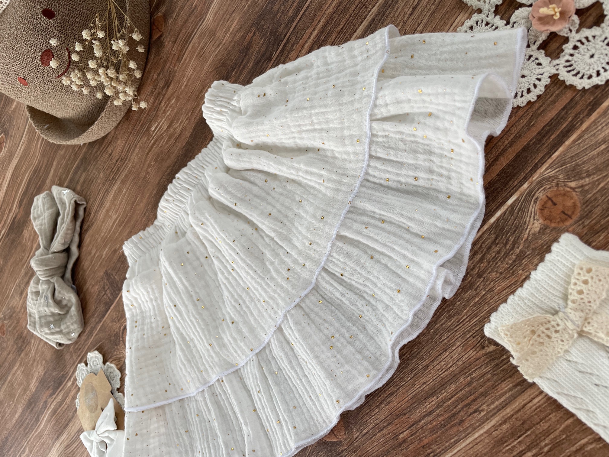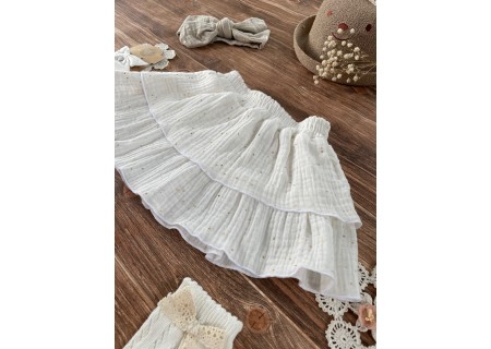 Spódniczka uszyta ze stu procentowego bawełnianego muślinu premium. Posiada dwie falbanki. W pasie wszyta gumka. Tkanina posiada delikatne złote kropki.