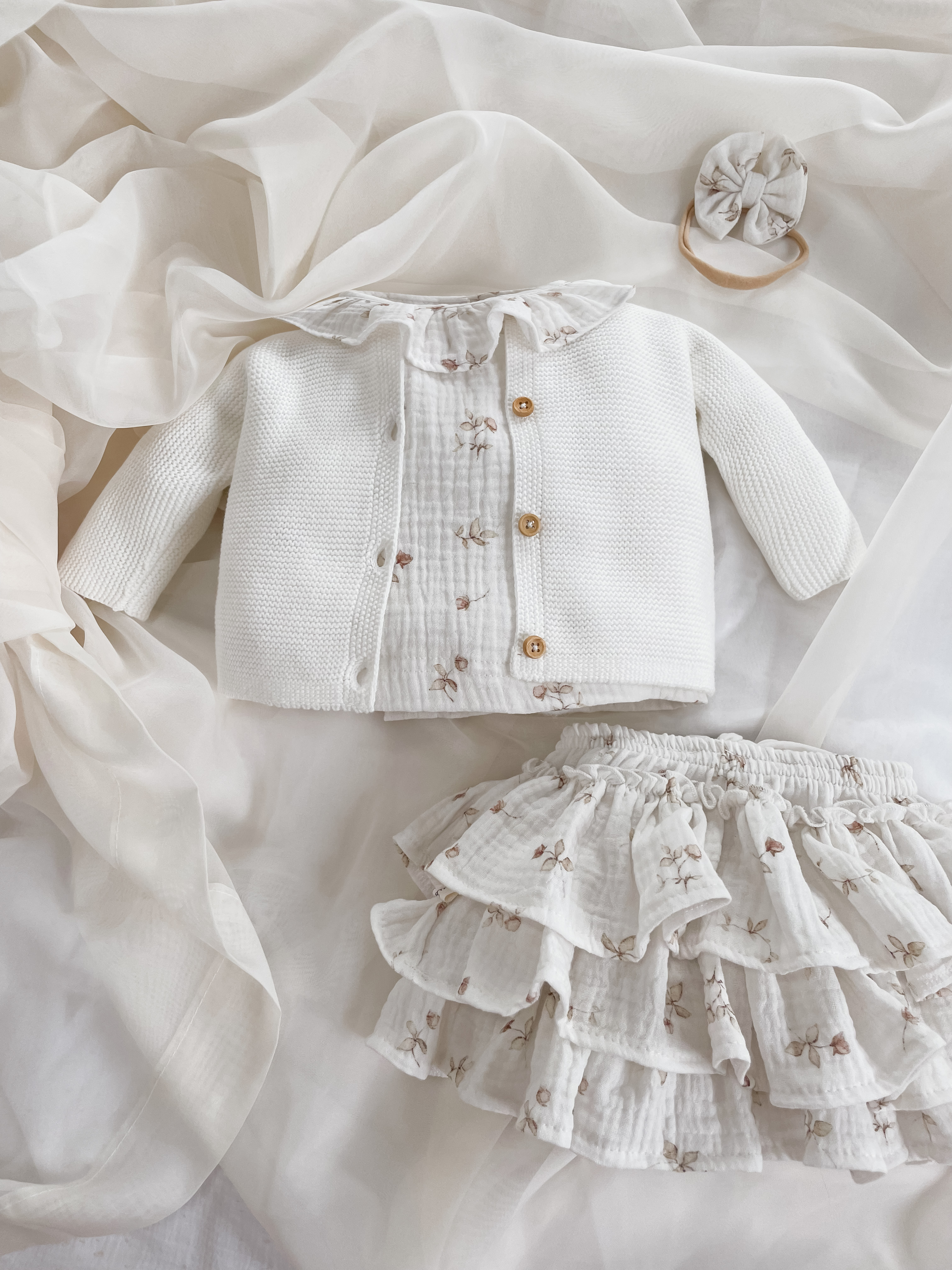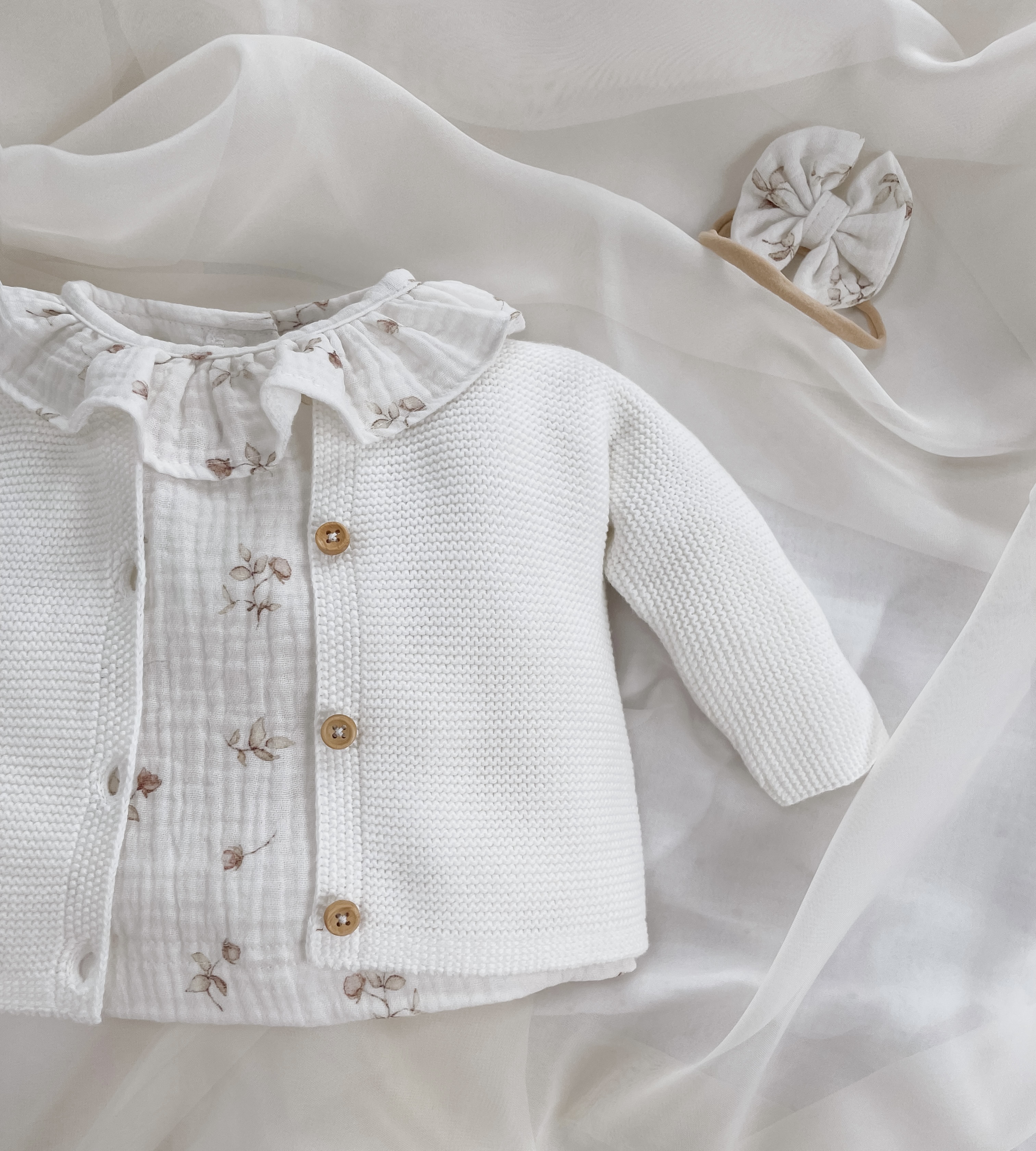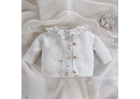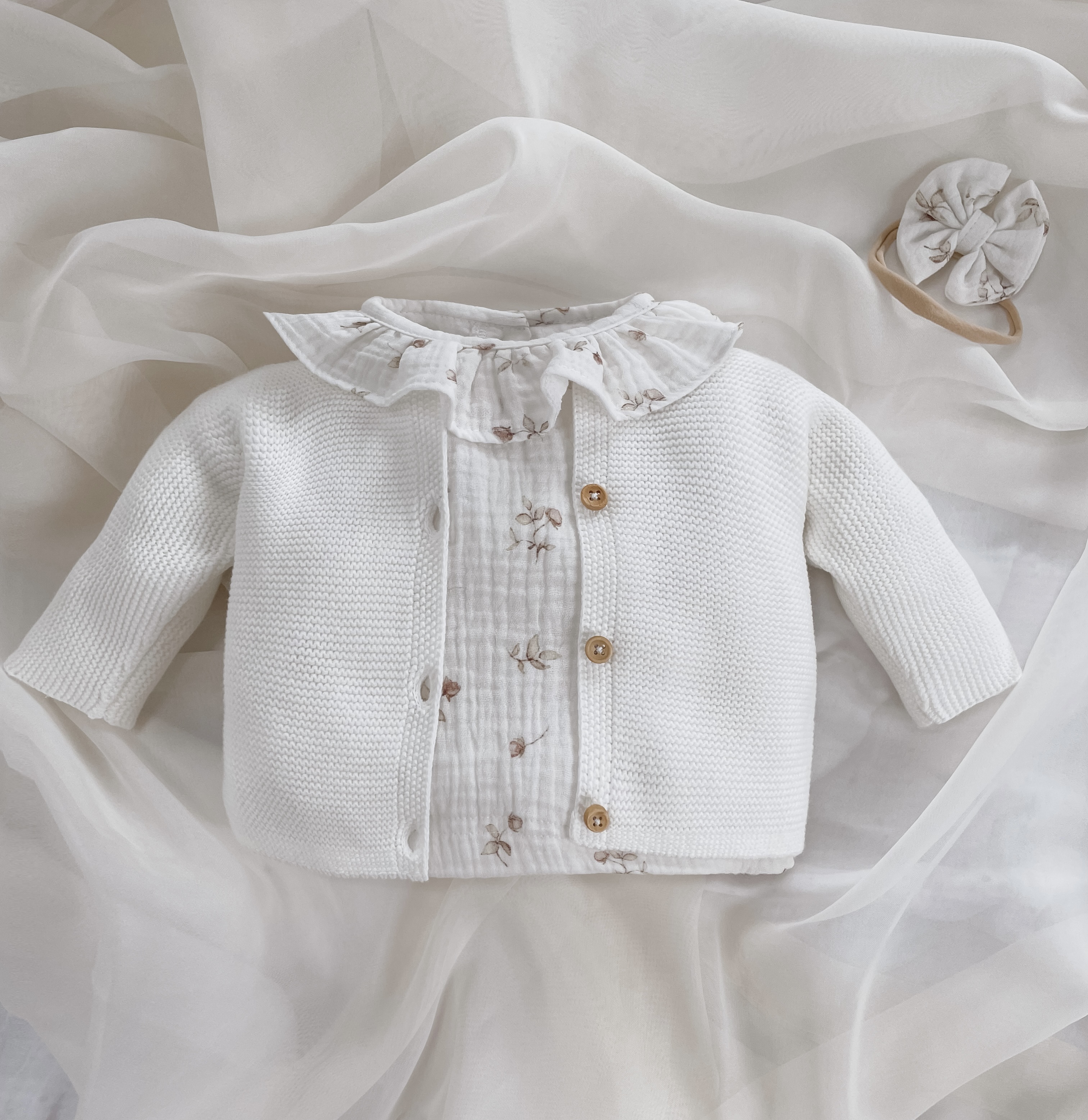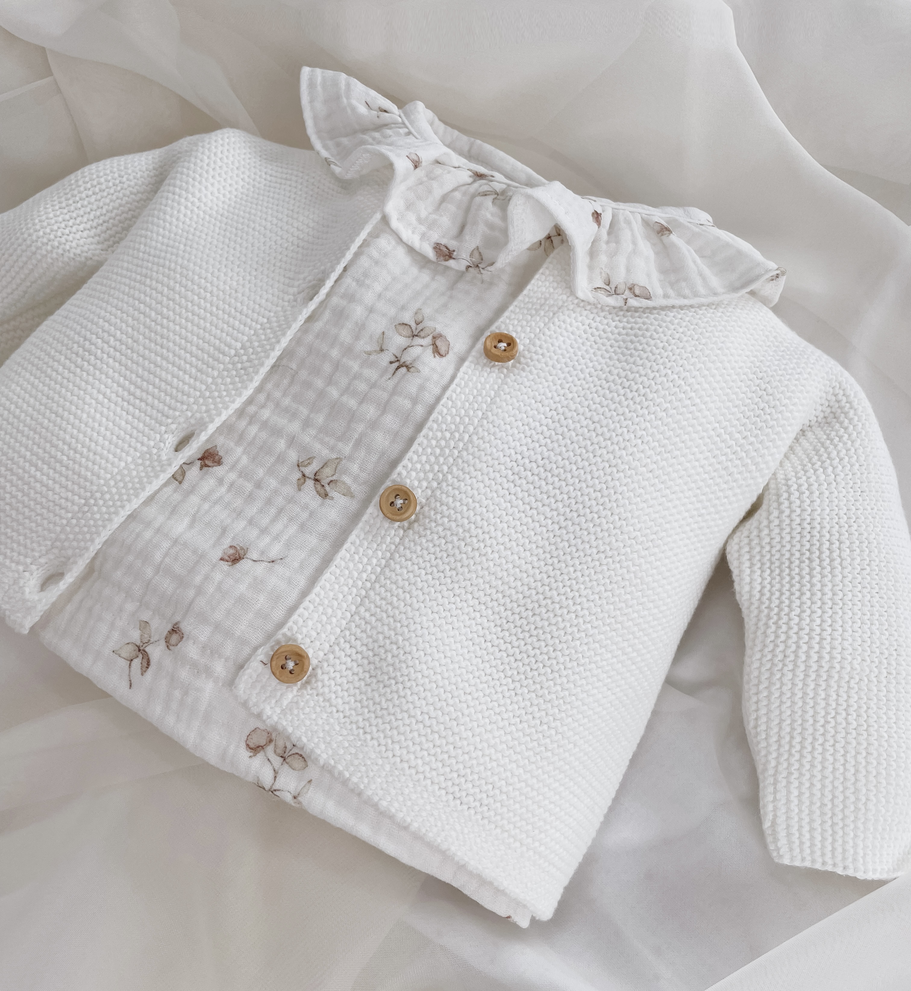 Sweter z dzianiny wykonanej ściegiem francuskim typu links. Okrągły dekolt. Długi rękaw. Zapięcie na guziki z przodu.