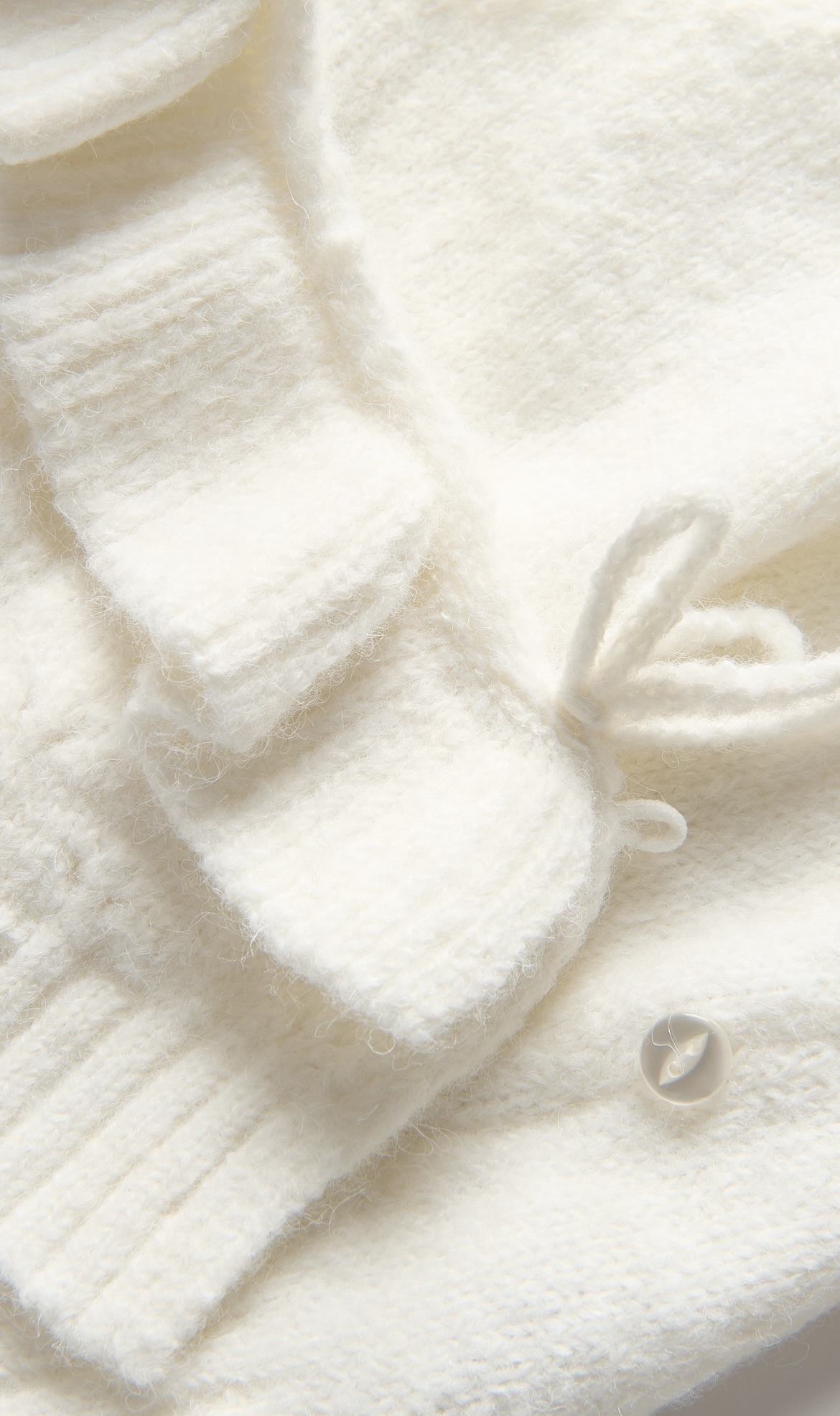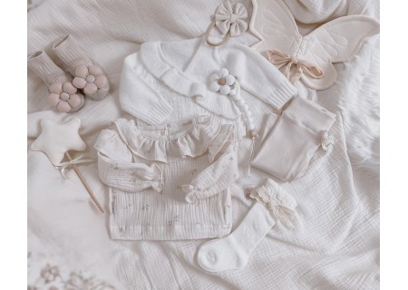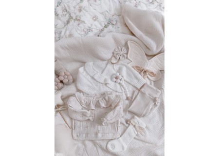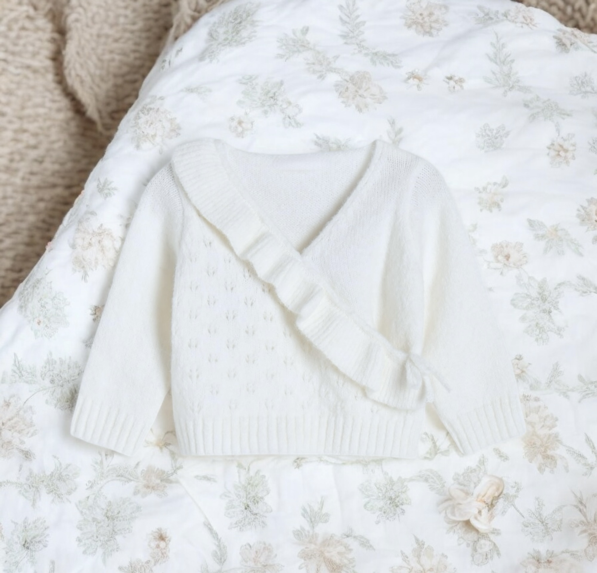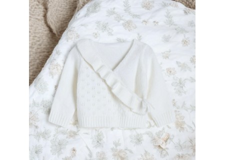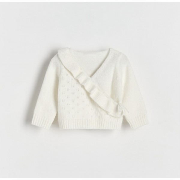 Sweterek niemowlęcy z niezwykle miękkiej dzianiny o ażurowym splocie z falbanką.