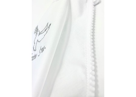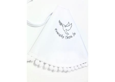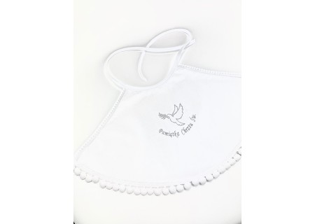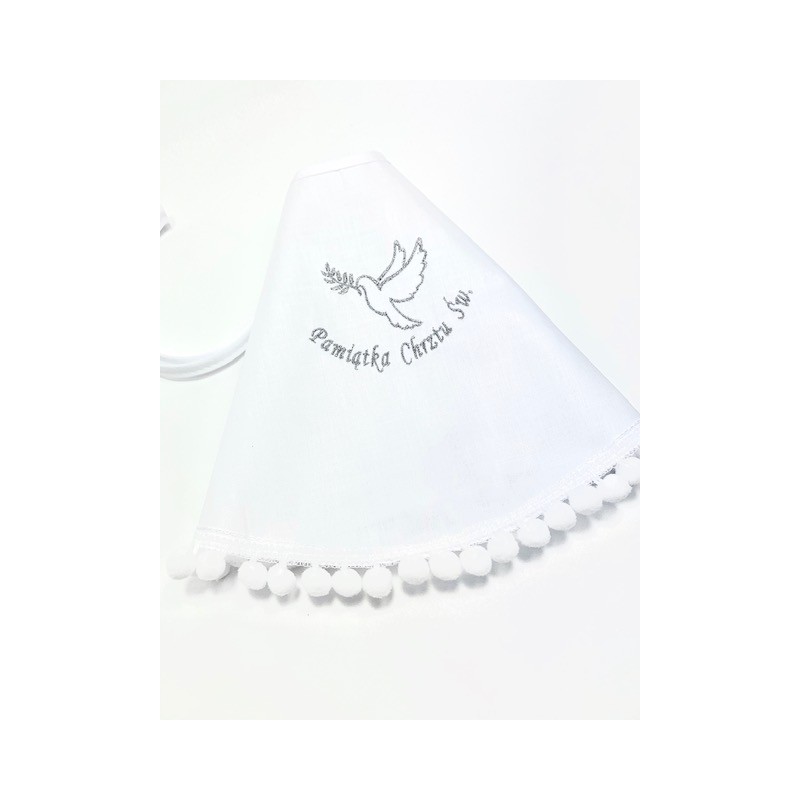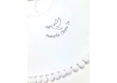 Na środku szatki znajduje się haftowany gołąbek z napisem „Pamiątka Chrztu Świętego”. Przy składaniu zamówienia prosimy o wybranie koloru haftu – do wyboru są trzy kolory - biały, srebrny oraz złoty. Wykonujemy najwyższej jakości hafty komputerowe, dlatego są one tak precyzyjne.