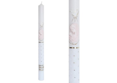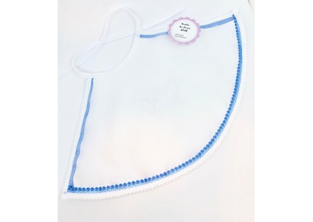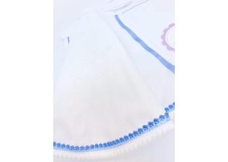 Na środku szatki znajduje się haftowany gołąbek z napisem „Pamiątka Chrztu Świętego”. Przy składaniu zamówienia prosimy o wybranie koloru haftu – do wyboru są trzy kolory - biały, srebrny oraz złoty. Wykonujemy najwyższej jakości hafty komputerowe, dlatego są one tak precyzyjne.