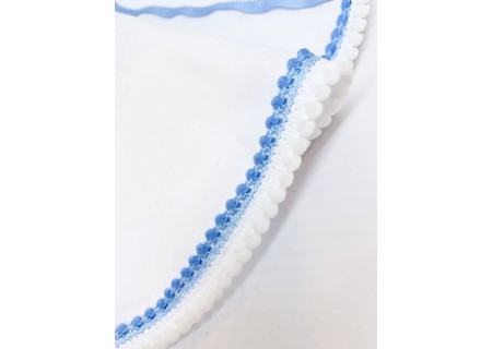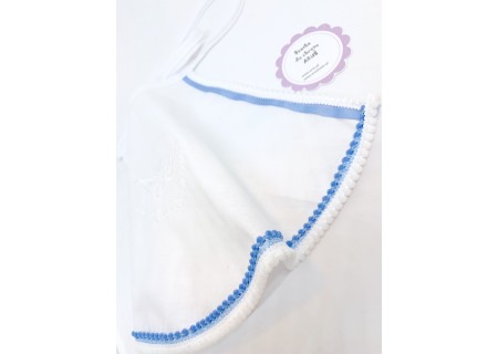 Szatka wykonana jest z wysokogatunkowej bawełny z satyną, dlatego ma dyskretny połysk. Z dołu obszyta jest tasiemką z niebieskimi bąbelkami.